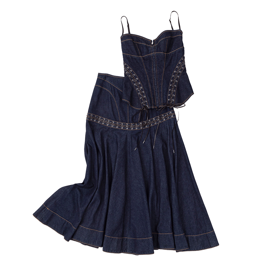 「The Figure: Feminine(その姿、女性的)」をコンセプトにデザイナー、舟山瑛美さんが女性の身体の曲線美やフォルムを独自の視点で描き出す「FETICO(フェティコ)」のコルセット風のトップとスカートをピックアップ。環境に優しいオーガニックコットンデニムは、軽く柔らかな肌触りが魅力的で、糸をロープ状に束ねて染めるインディゴロープ染色により、奥行きのある自然な色落ちを表現。女性の美しいラインを際立たせるレースアップデザインがセンシュアルなムードを添えた、ブランドの美学を体現したアイテム。セットアップとしてもおすすめです。コルセット ¥57,200、スカート ¥68,200