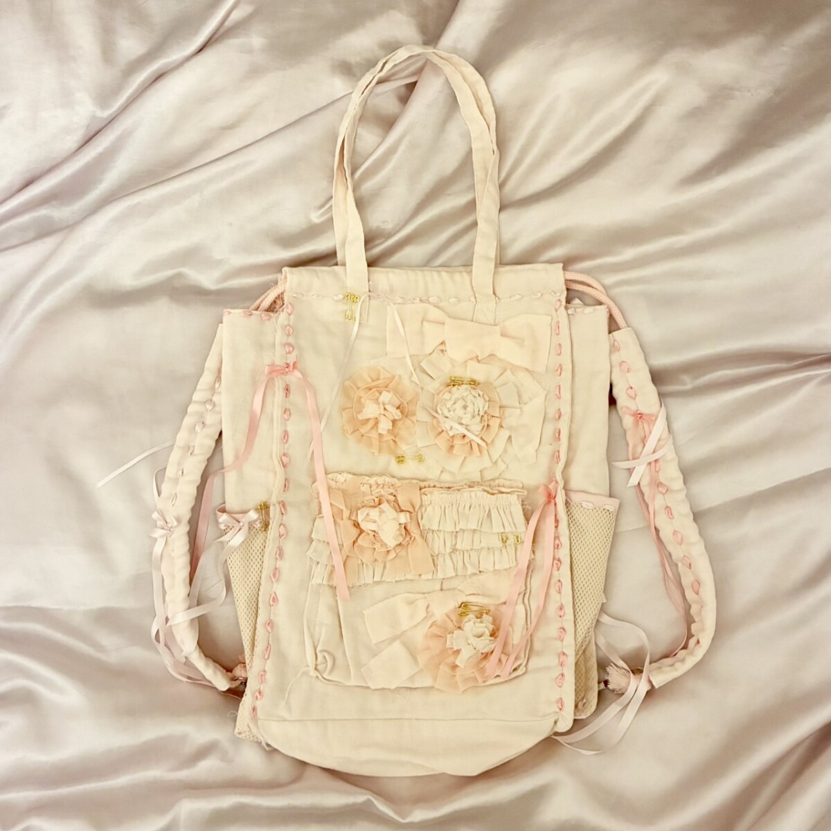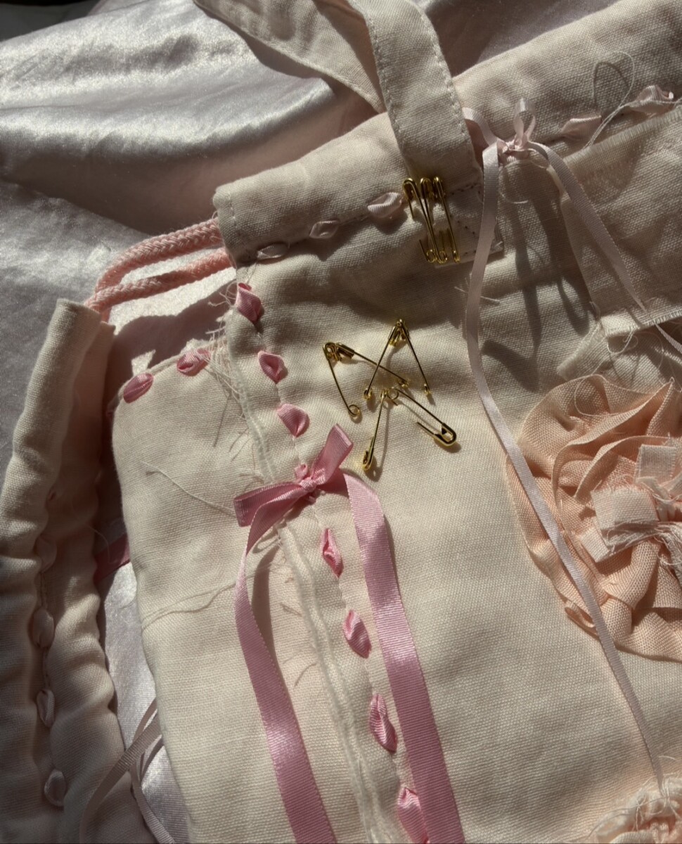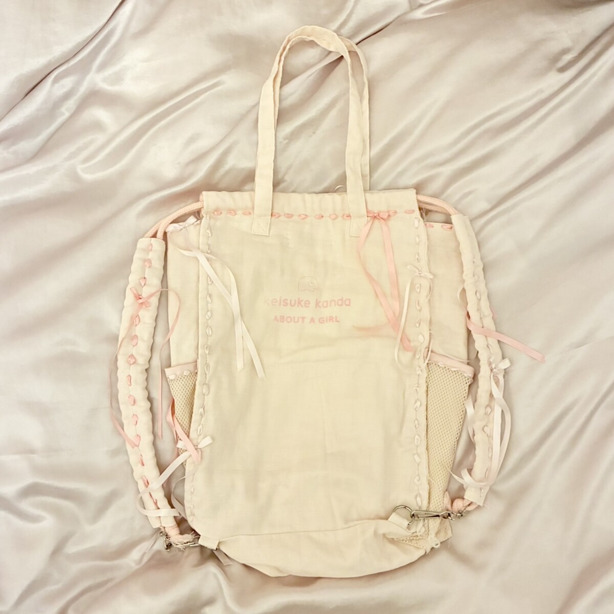 keisuke kanda(ケイスケ カンダ)」のお花とリボンが特徴的なPunkの花咲くガーゼリュックです。これまでのkeisuke kandaにありそうでなかった“お花”をテーマにしたアイテムで、2025年初夏コレクションの全国ツアーで出会い、一目惚れした一品です。ペールピンクのガーゼに、太さや色味の異なるピンクのリボン、そして複雑なフリルが重なり合うようにあしらわれ、過剰なほど可愛く装飾されています。さらに金色の安全ピンが加わることで、パンクカルチャーの要素が可愛さの中に落とし込まれ、keisuke kandaらしいこだわりが細部まで感じられます。