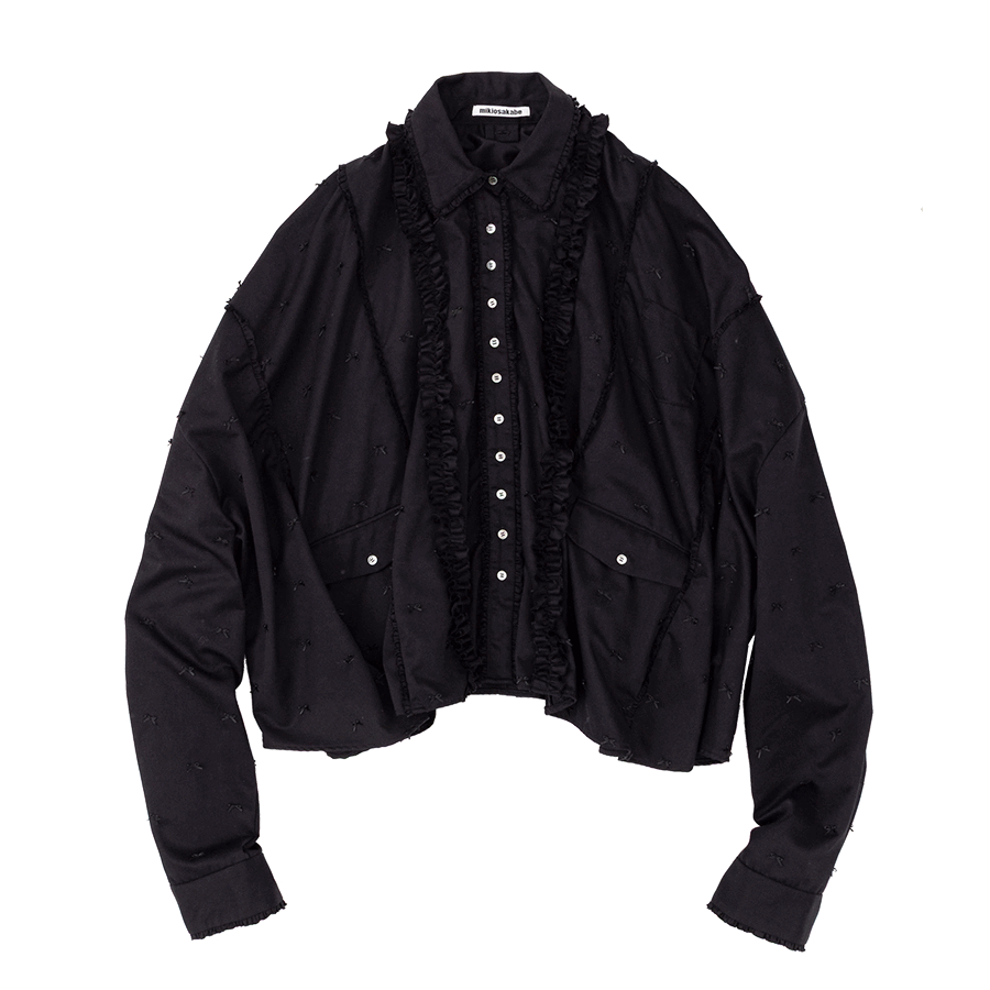 坂部三樹郎さんが手がけるMIKIOSAKABEのブラウスは、襟もとやヨーク、袖口にあしらわれたフリルと、全面についた小さなリボンがラブリー。ビッグサイズの肩パッドが付属し、ボタンで装着可能。肩パッドを外すと、ドロップショルダーの超ロングスリーブを手元でたっぷりたくし上げ、可憐な印象で着こなせる。パッドを装着すると、たちまち圧倒的な存在感を放つシルエットに様変わり!長めの丈でワンピースとして着るのも◎。肩パッドを自在に取り外して、気分やシーンに合わせてシルエットを変えて楽しんで。ブラウス¥85,800 MIKIOSAKABE