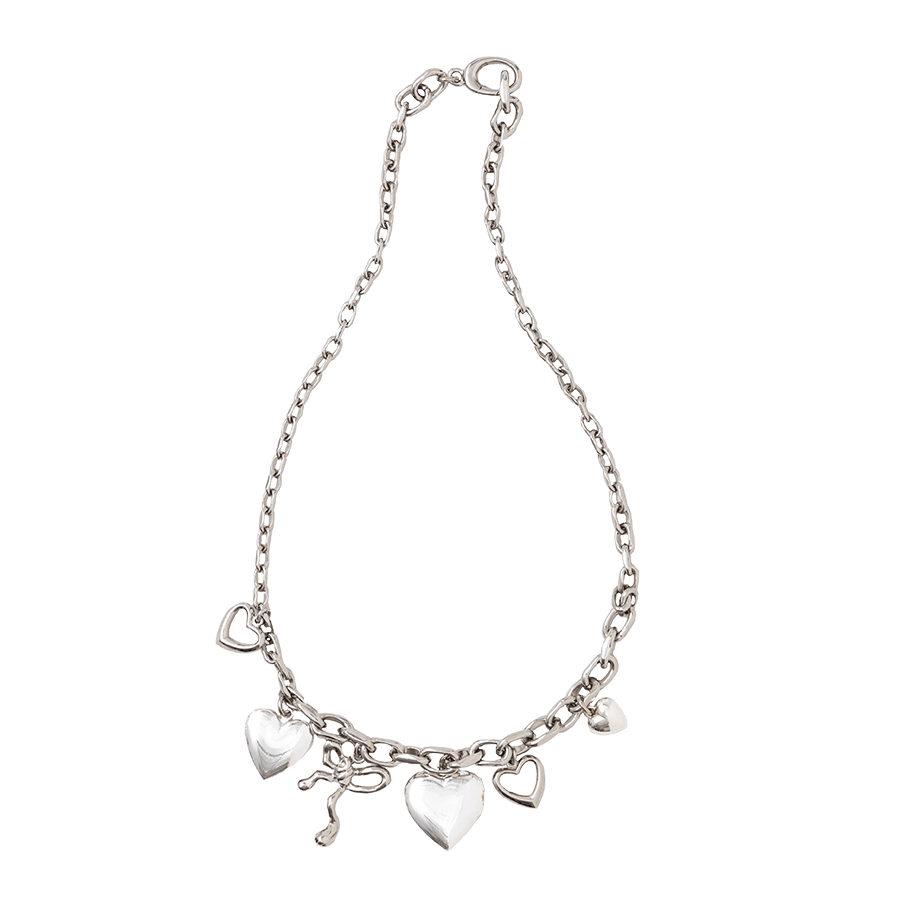 2009年にスタートしたコスチュームジュエリーブランド、Soierie(ソワリー)のシルバーネックレス。可愛らしいハートとリボンのモチーフを無骨なチェーンにあしらったクールなデザイン。コスチュームジュエリーならではのデザイン性とボリューム感が、秋冬の装いにさりげなくエッジを与えてくれる。シルバーで統一され、どんなコーディネートにもすっと馴染みやすく、カラーアクセサリーとの重ね付けもおすすめ。長さを調整することもでき、チョーカーとしてもミドル丈でも楽しめる。ネックレス ¥16,500 Soierie