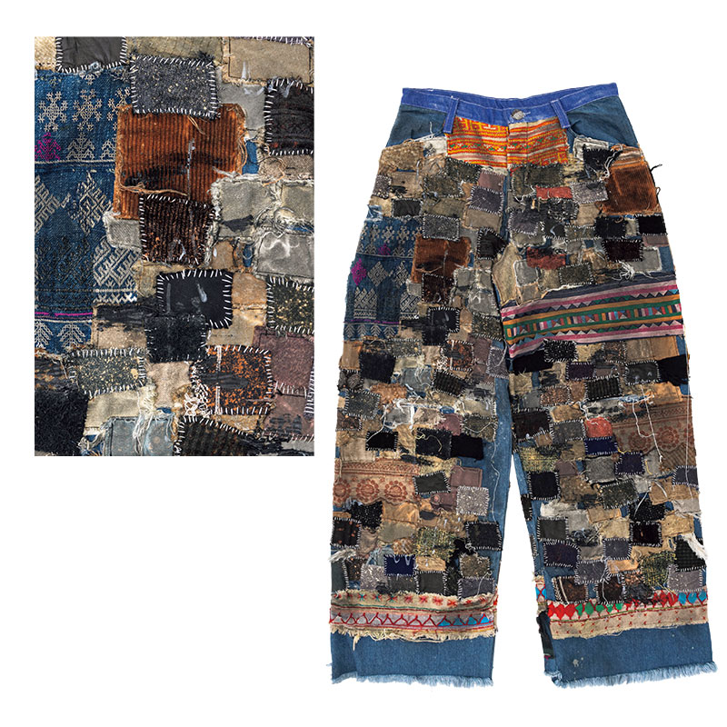 黒デニムにバイオブリーチを施して色を抜いた後、黒いパッチを当てて後染め。さらにストーンウォッシュ加工で、まだらに色を抜いたクラフトパンツ¥180,000 パッチの装着は、’80年代のパンクスにならい木工用ボンドを使用。現代風のバギーシルエットにアップデートした。
