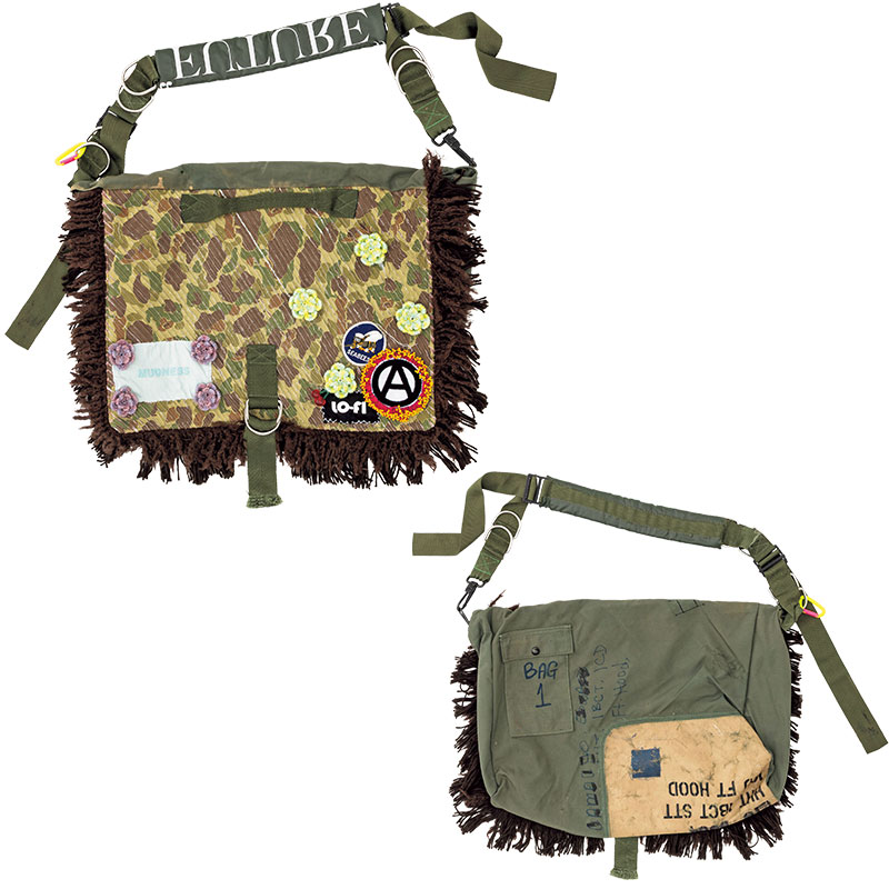 ’60年代のボンサックバッグをリメイク。ニューヨークのピストバイカーにインスパイアされて制作。表地は3重に布を重ね、スラッシュ状の切り込みを入れ、すべてにステッチを施している。かぎ針編みの装飾もすべて手仕事で、クラフト感あふれる一点物。¥58,000