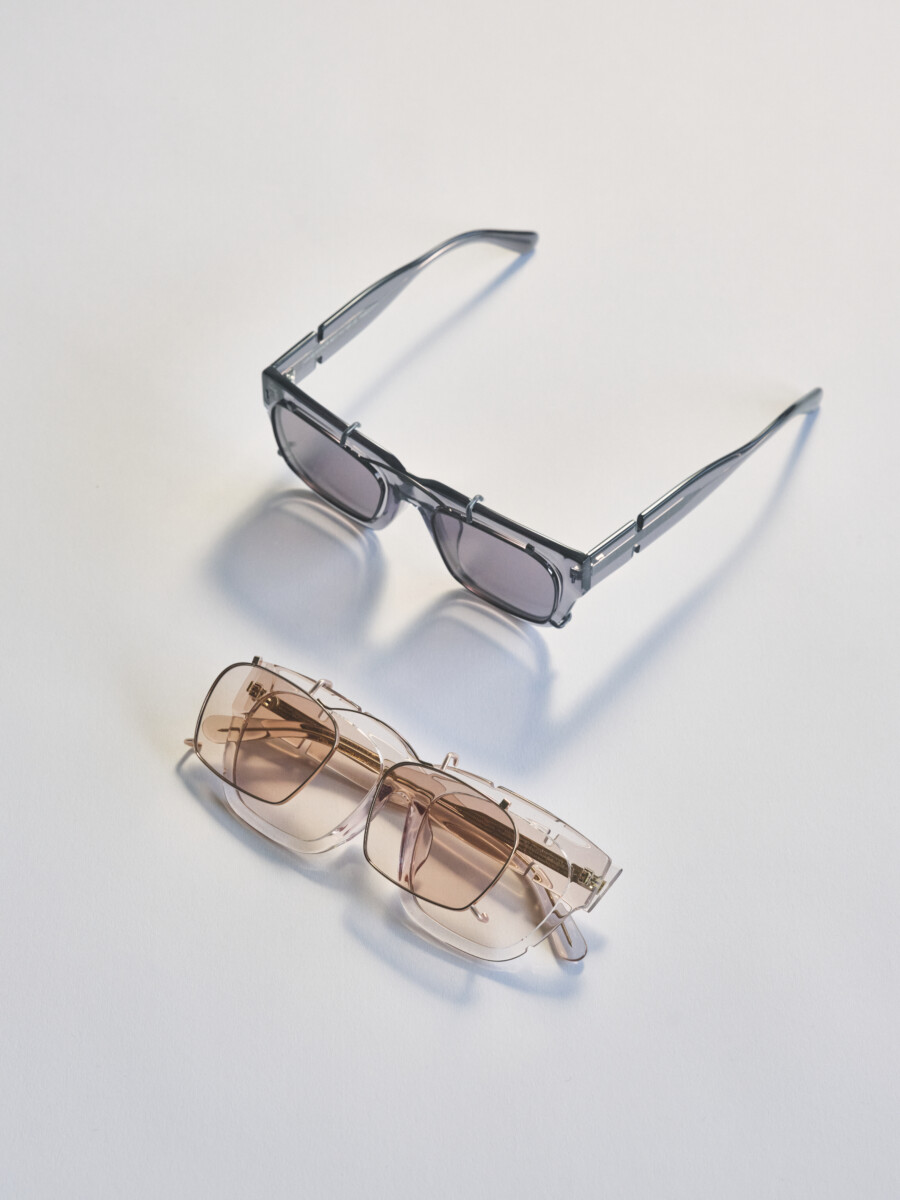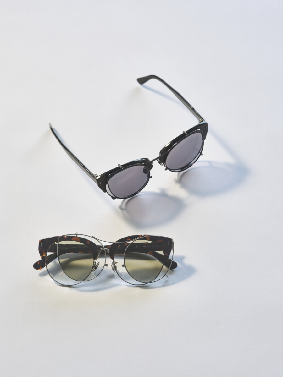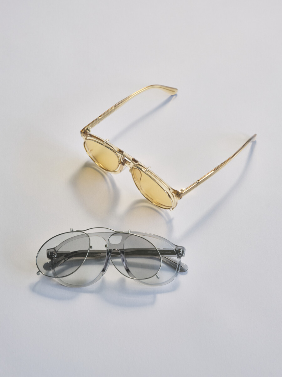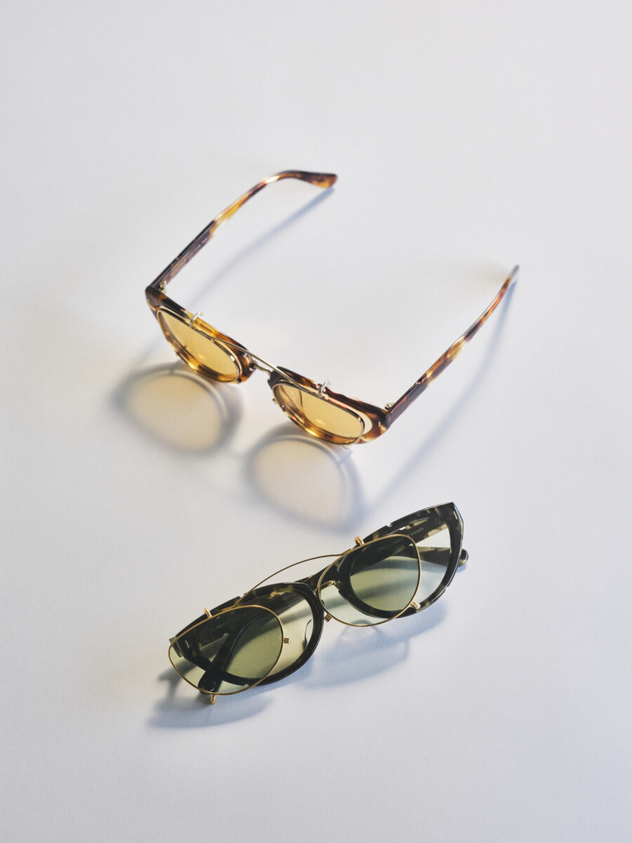 サングラス本体にはカラーレンズのクリップオンが取り付けられており、レトロな雰囲気溢れるアビエーターメガネには柔らかな印象が、ウェリントンメガネにはイノセントな空気感がプラスされ、無二のシルエットを生み出している。