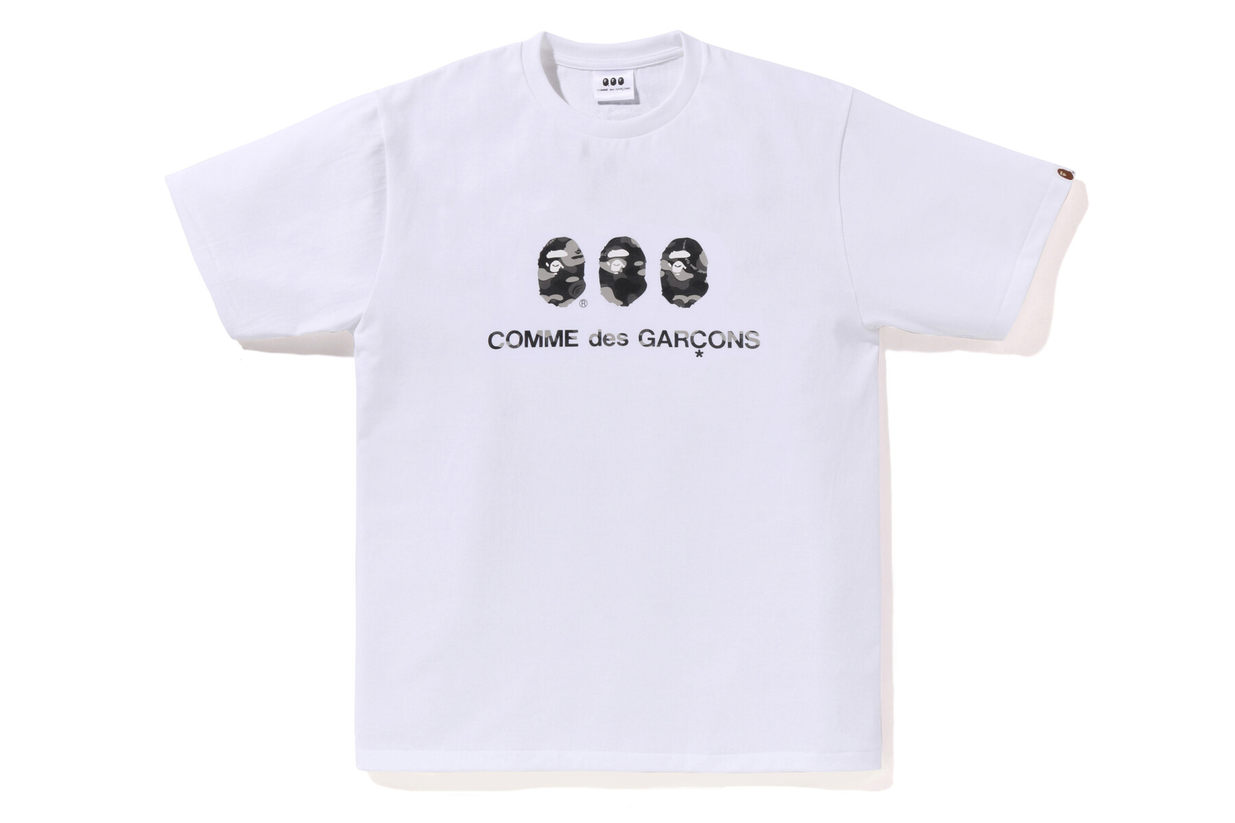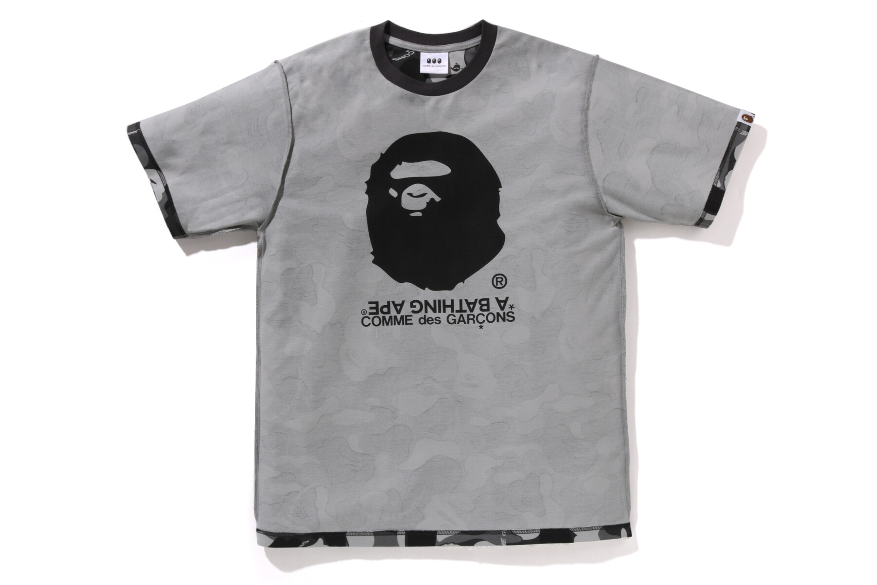 アイコニックな3体のエイプ ヘッドとコム デ ギャルソンのロゴが配された定番デザインや、裏返したカモフラージュ柄のカットソーにエイプ ヘッドが施された「INSIDE OUT CAMO TEE」などがラインナップする。