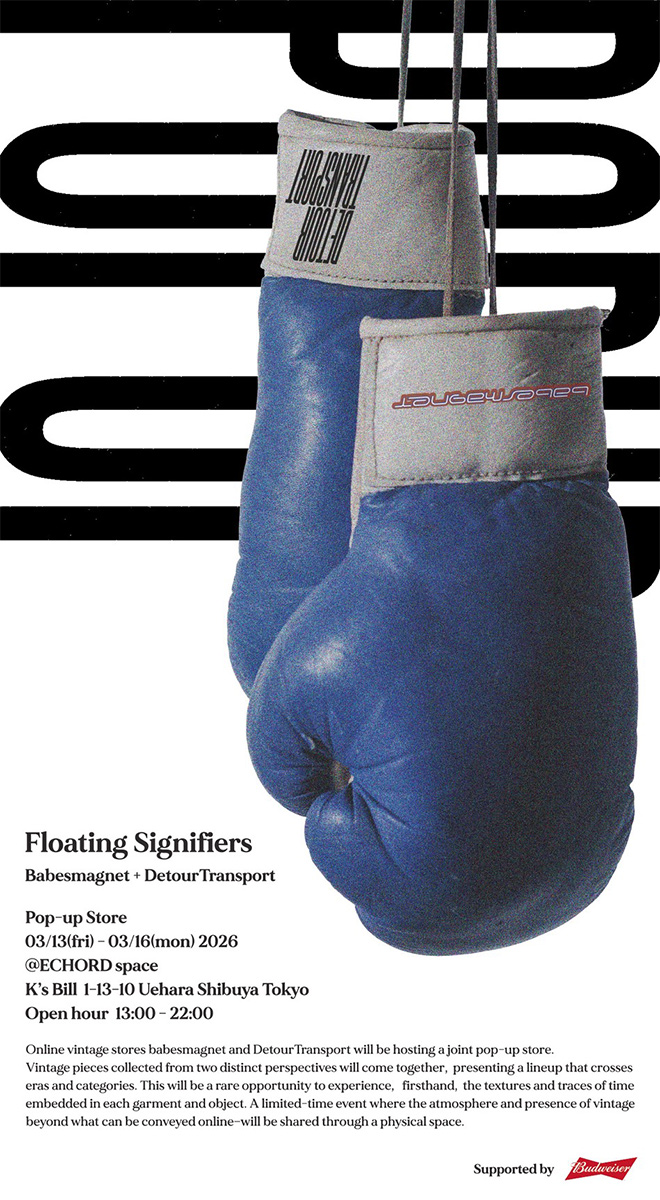 ヴィンテージ愛好家たちが、世界各国から自身のために買い集めた古着をエディットする、「babes magnet(ベイブスマグネット)」と映像やデザインのクリエイティブスタジオから派生した、姉妹店の「Detour Transport(ディートゥア トランスポート)」。どちらも昨年誕生した、注目のオンラインヴィンテージショップだ。この 2 店が合同で初のポップアップショップ「Floating Signifier」を展開する。