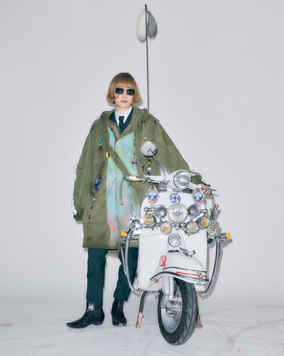 さらに、スタイリストのTatsuya ShimadaとフォトグラファーのTsutomu Onoによる、その会場の空気感を撮影したルックも公開。白を基調としたミニマルな背景に、エッジィさと洗練さが融合したユニークな世界観が映し出されている。