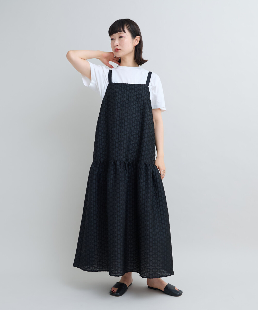 キャミワンピースとスカートは、丸いカーブと直線がマッチしたアイキャッチロゴが目を引くモチーフを、総柄のジャカード生地で表現。桐生産地で別注織りしたオリジナル素材で仕立てた、贅沢なハリ感を生かしたデザインがポイントだ。