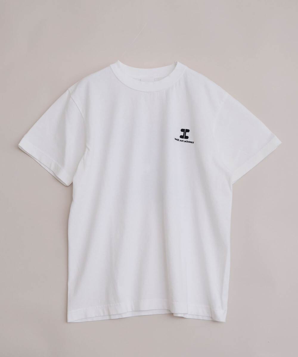 Tシャツの胸元にはアイコンとなるモチーフと、白、黒、赤を意味するドイツ語の単語が刺繍され、バックプリントにはさらに大胆なアイコンデザインが施されている。また、オリジナル柄のプリントグラフィックは、線と曲線を繊細にマッチさせ、モノクロームの世界観を表現した。これは一部にツヤプリントを採用することで、深みのある仕上がりに。ボディにはボールバイオ加工が施され、柔らかな質感を引き出している。