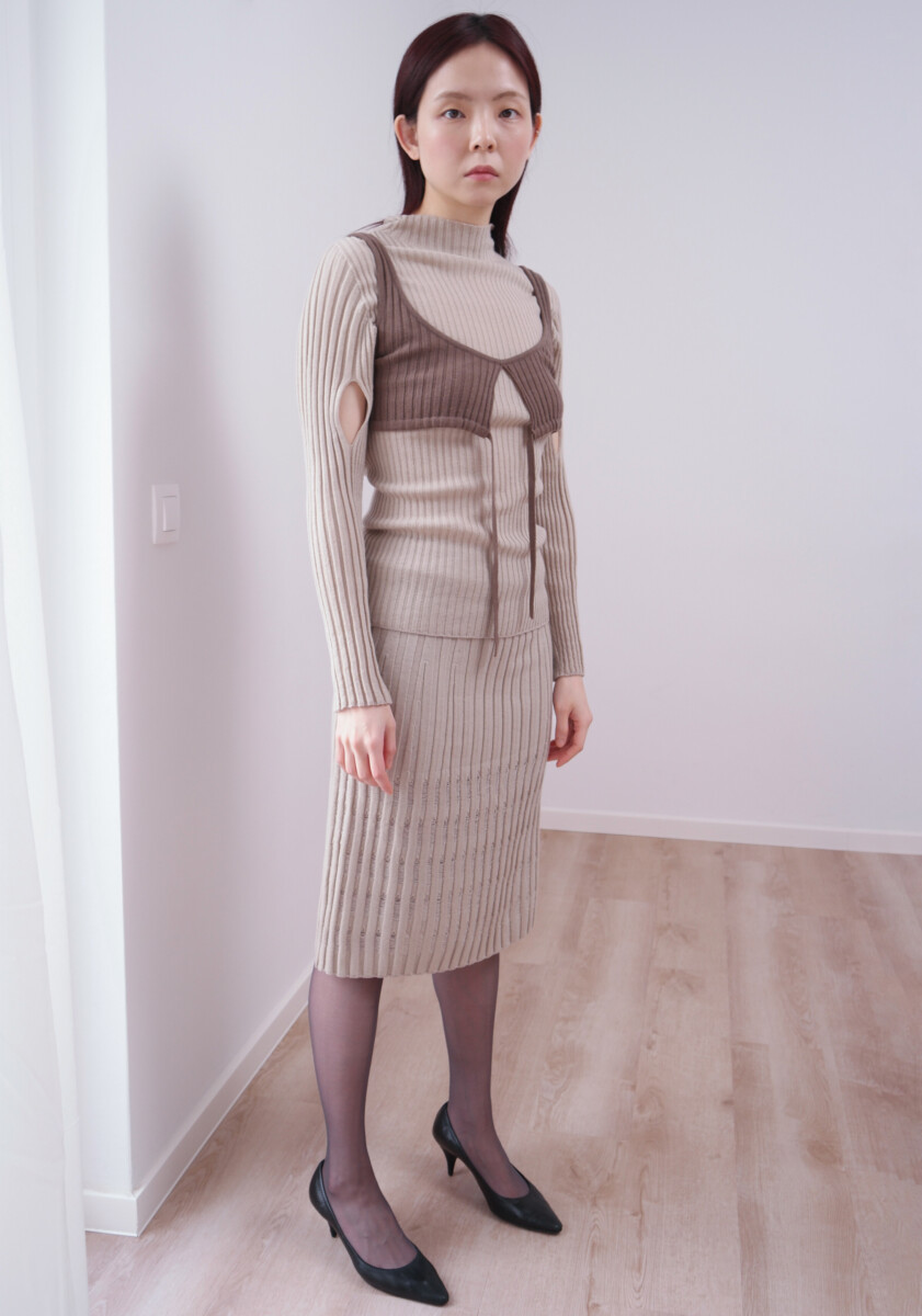 フェミニンなシルエットのニットトップやスカートなどが展開され、ブランドの世界観を存分に体感することができる。