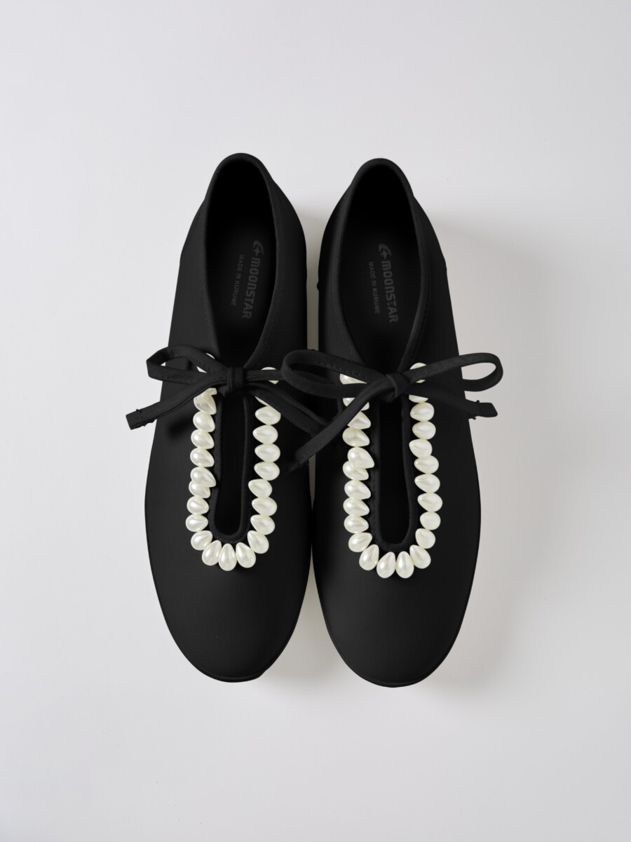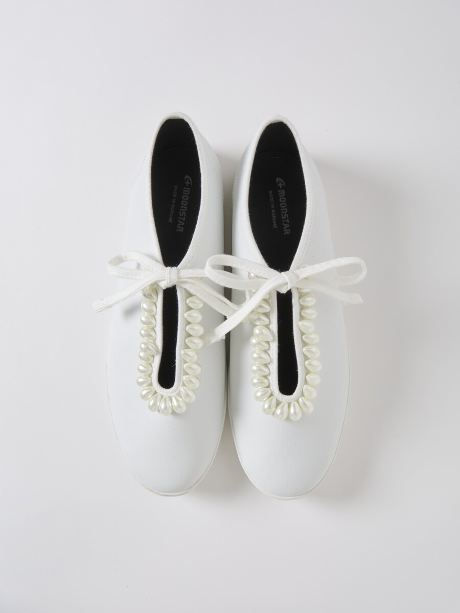 ムーンスターのヴァルカナイズ製法による「LITE PRIM」シリーズをベースに、通常のキャンバス素材ではなく、柔らかく手入れのしやすい合成皮革を採用した特別仕様のフラットシューズ。雫型のパール装飾を一粒ずつ手作業で施し、ラインヴァンドらしい繊細なムードをプラスしている。