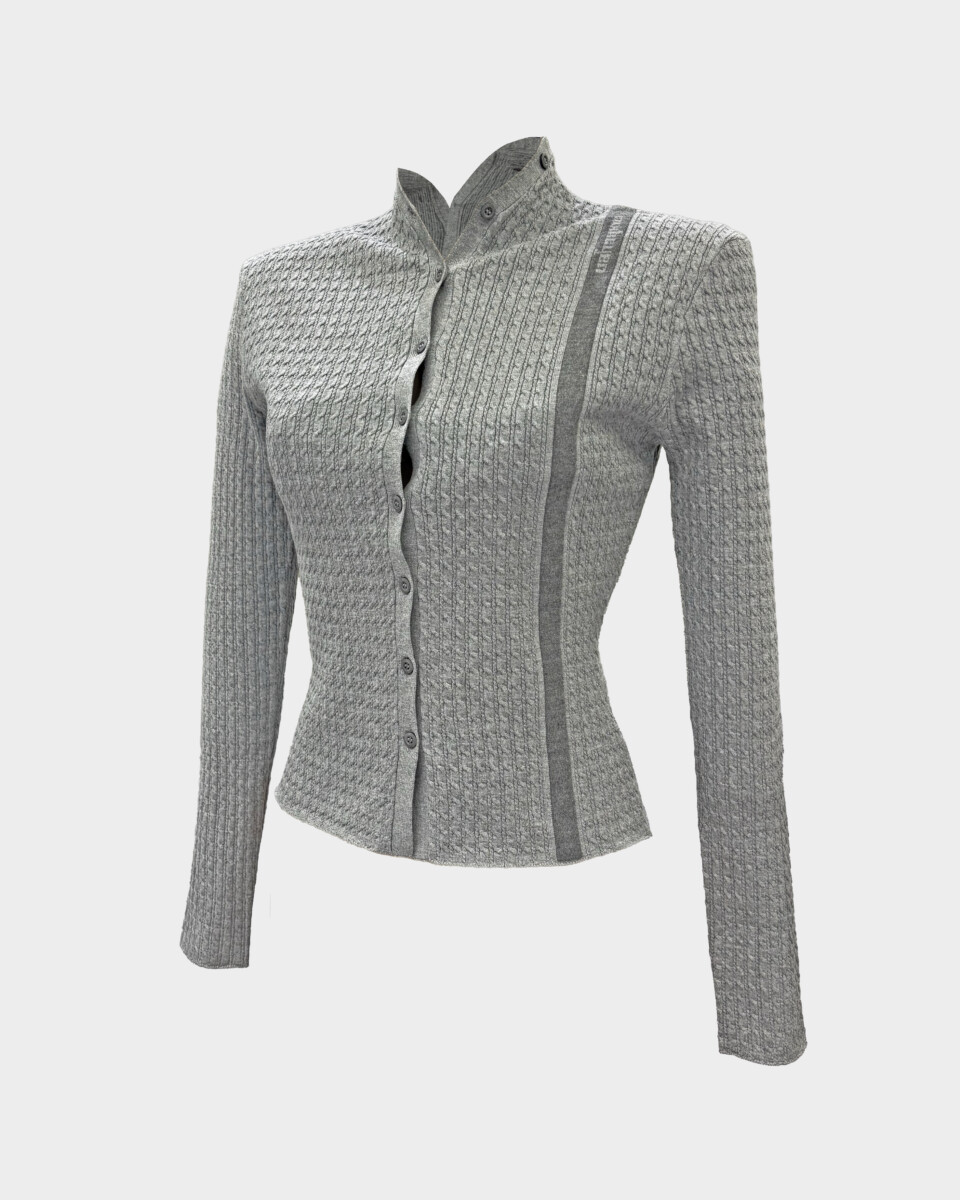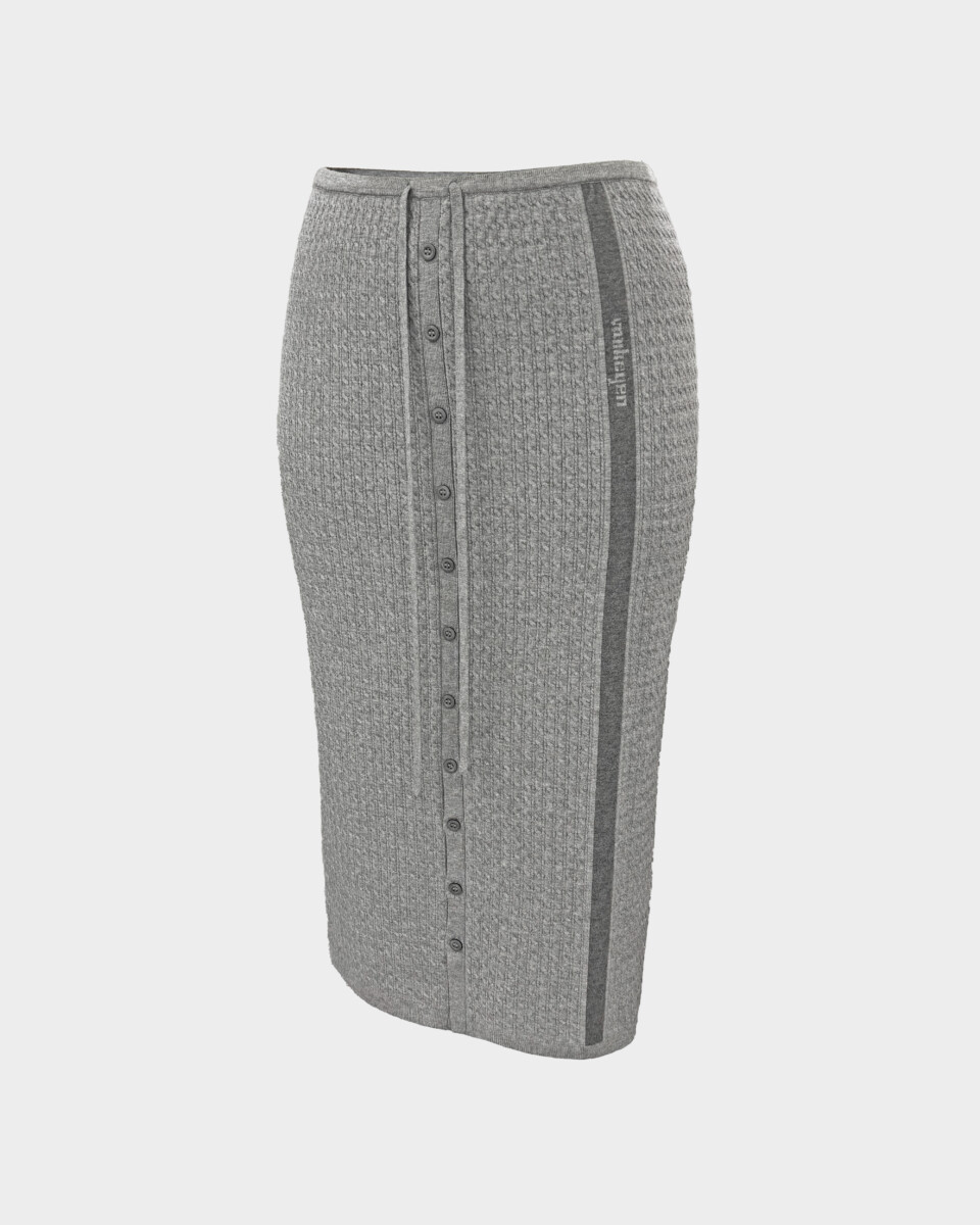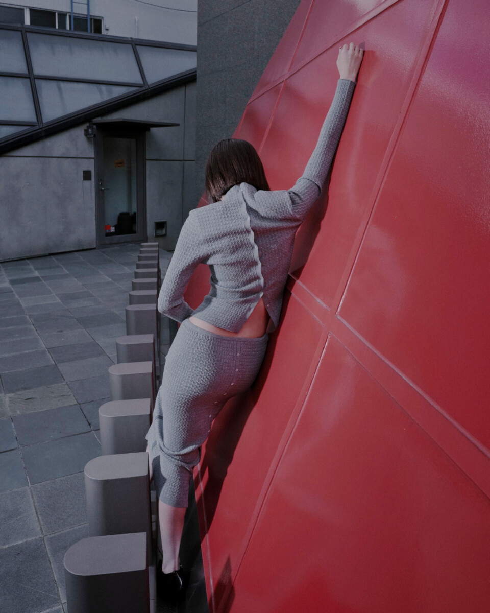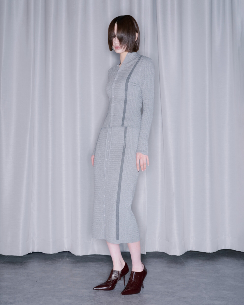 ポップアップ先行発売の「EcoVero Veil Cable Knit Cardigan」は構築的な形のショルダーにユニークなネックラインが特徴で、「EcoVero Veil Cable Knit Skirt」はミニマルなシルエットと長めのドローコードが、ブランドらしいモードな雰囲気と快適な着心地を両立したものになっている。