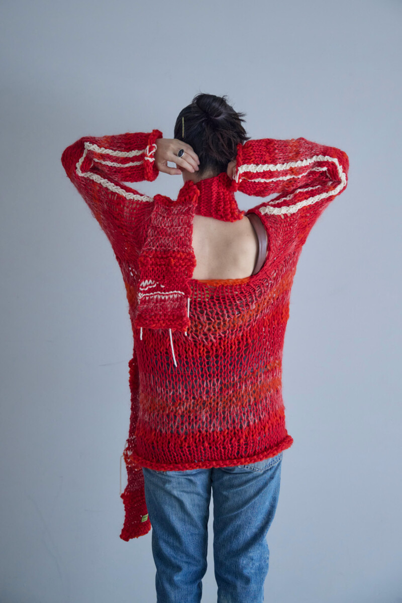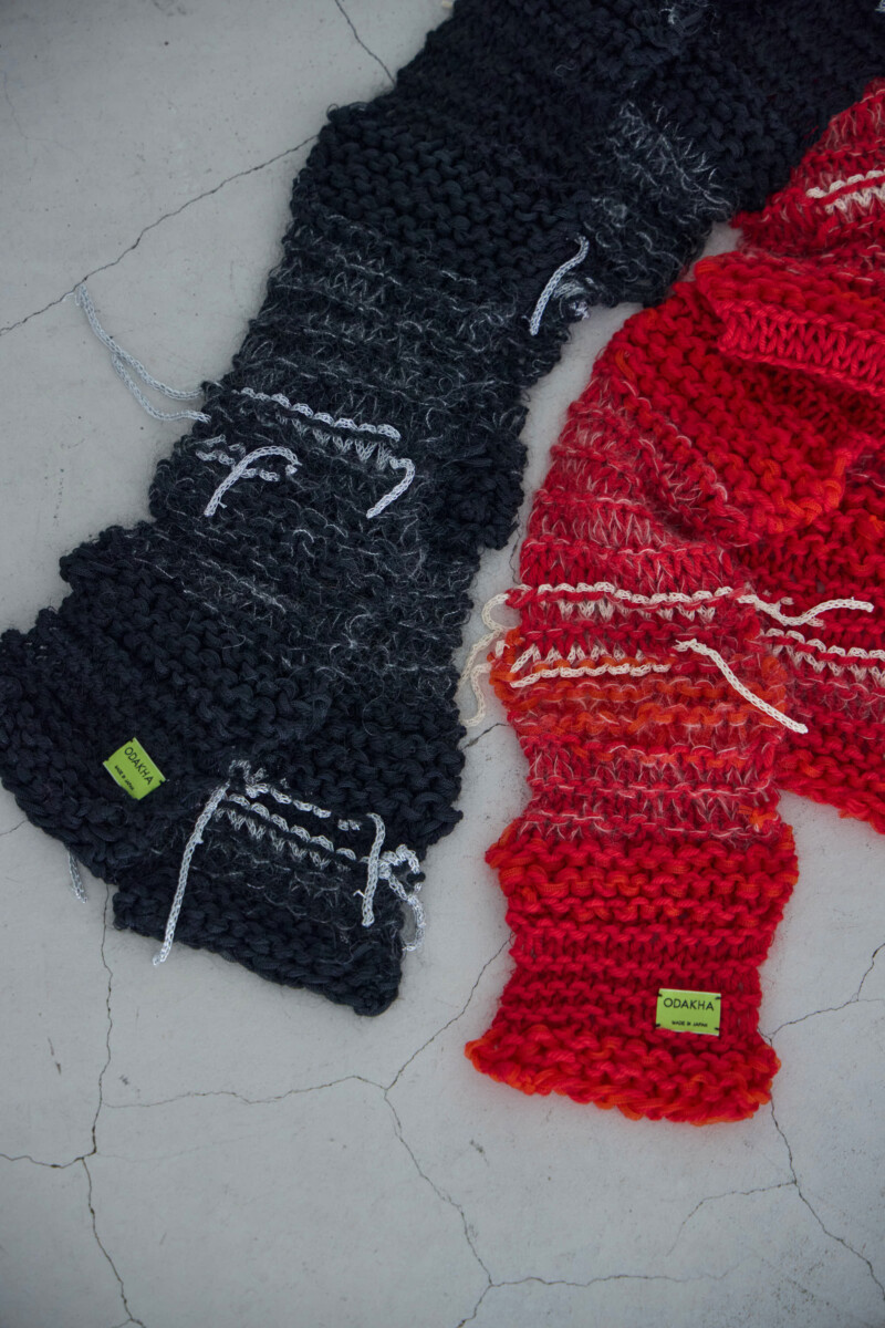 今回展開されるプルオーバーニットとマフラーは、ザニームのコンセプター・長尾悦美さんが実際に着たいニットをオダカが具現化した特別なアイテム。長めの袖に入ったラインがスポーティさを演出し、背中や首元の開きで抜け感をプラス。前後どちらでも着られる2way仕様となっている。