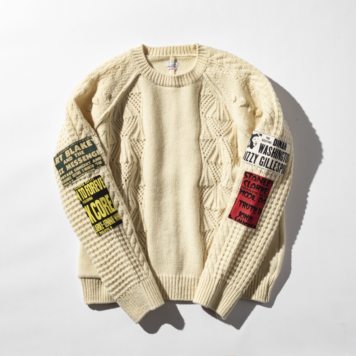 「JAZZ HEROES MERINO KNIT SWEATER」は1960年代のモッズカルチャーから着想したアイテムで、当時の若者たちが自身の応援するフットボールチームや行きつけのパブのロゴタオルを服に縫い付けていたというストーリーをヒントに制作されたもの。