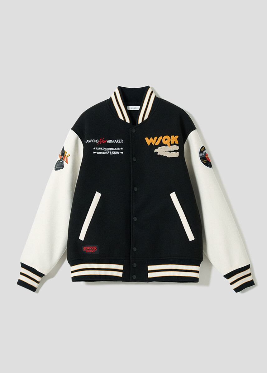 中でも「The SQUAWK|スタジャン」は登場人物のロビンとスティーブが立ち上げた同名のラジオ局から着想を得たもので、バックに配されたラジオ局のロゴと青いバンのワッペンが印象的。