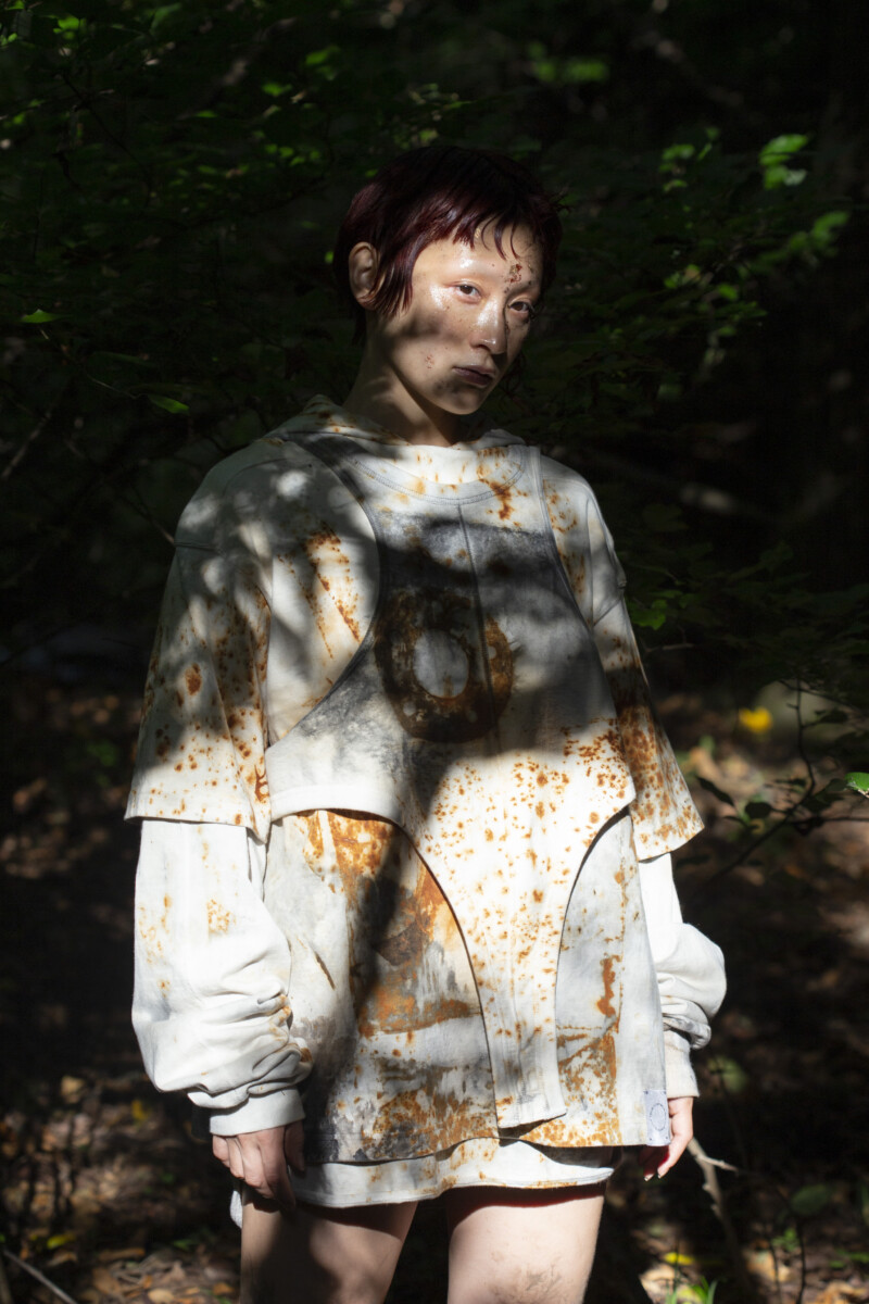 展示の本質に据えているのは「生と死」、「朽ちと再生」、「錆と布」、「人と自然」の円環。すべてが途切れず、次へと渡されている思想を衣服で体現する。