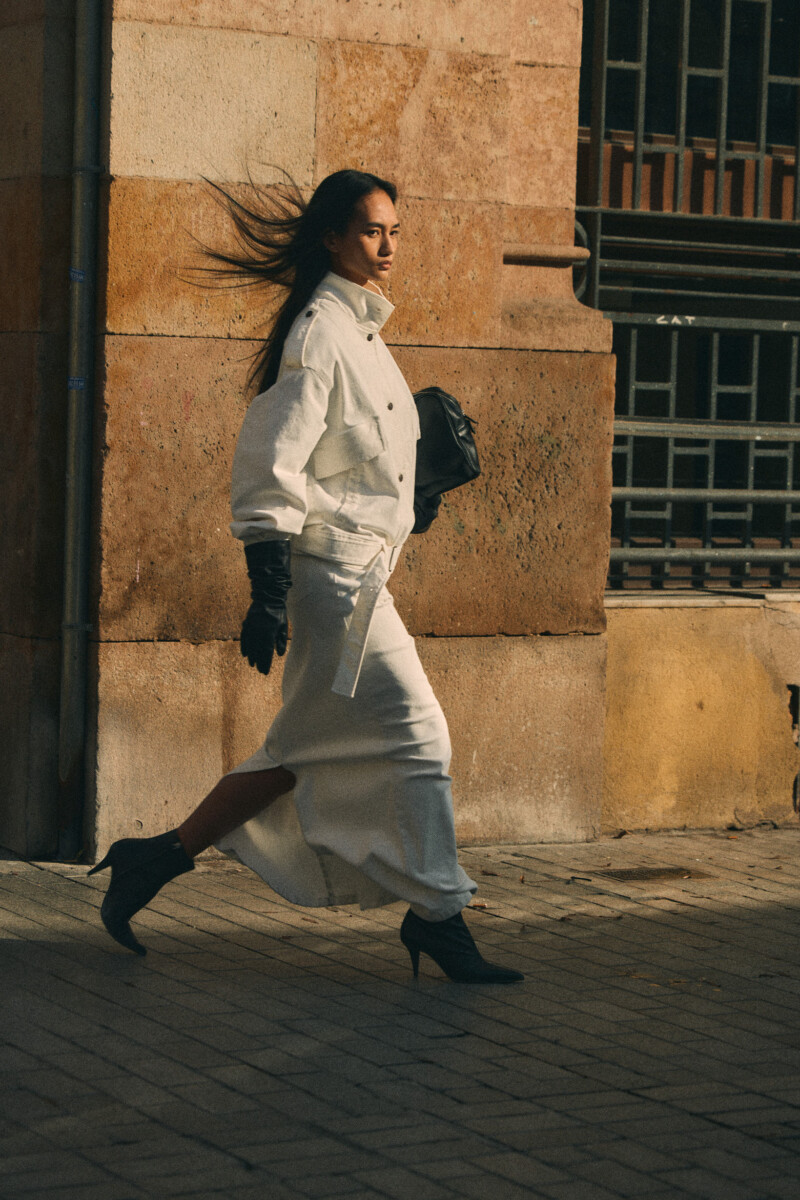 ウィメンズコレクションは、ワークジャケットやレザーアウター、デニムジャケットなどのベーシックなアイテムを中心に、シルクやウール混のトラウザーやスカート、レイヤードに適したトップなど、軽やかさと洗練を兼ね備えたアイテムが揃う。