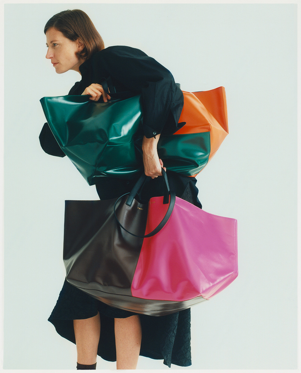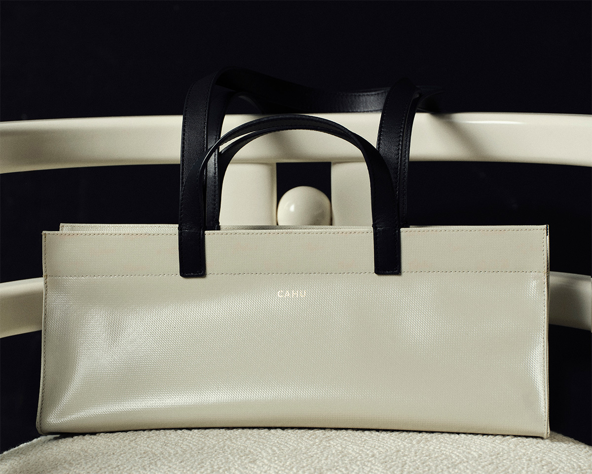建築的でシンプルなフォルムには、気負わず物を入れて持ち歩けるタフさがあり、ハンドルや細部には上質な意匠が施されている。日常に必要な機能を備えながら、きちんとファッションとして成立するCAHUのバッグには、スタイリストやアートディレクターとして磨いてきたクレマンスの感性が反映されている。