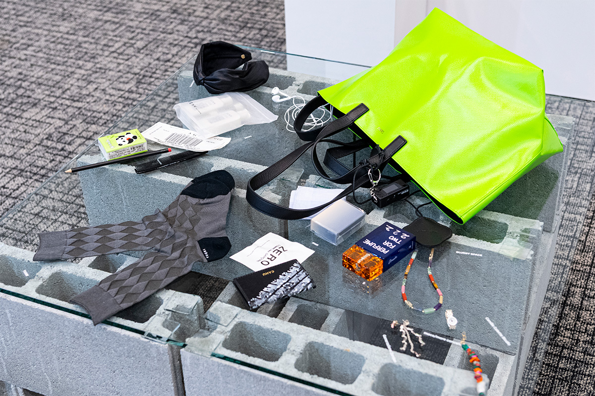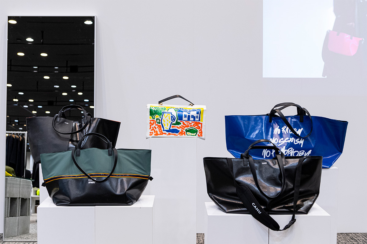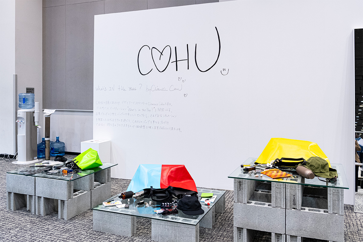 今回、CAHUのブースの横で、“What’s in the Bag?”をテーマにしたインスタレーションも展開。クレマンス自身の私物とTRANOÏ TOKYOに出展しているブランドのアイテムを、スタイリストならではの視点でセレクトし、バッグの背景にあるライフスタイルや価値観を伝える展示となっていた。CAHUのバッグが目指しているのは、ただ物を入れるための道具ではなく、手にすることで日常や気分に変化をもたらしてくれる相棒のような存在だ。会場には日本各地からバイヤーやプレスが訪れ、初出展ブランドへの関心の高さもうかがえた。
