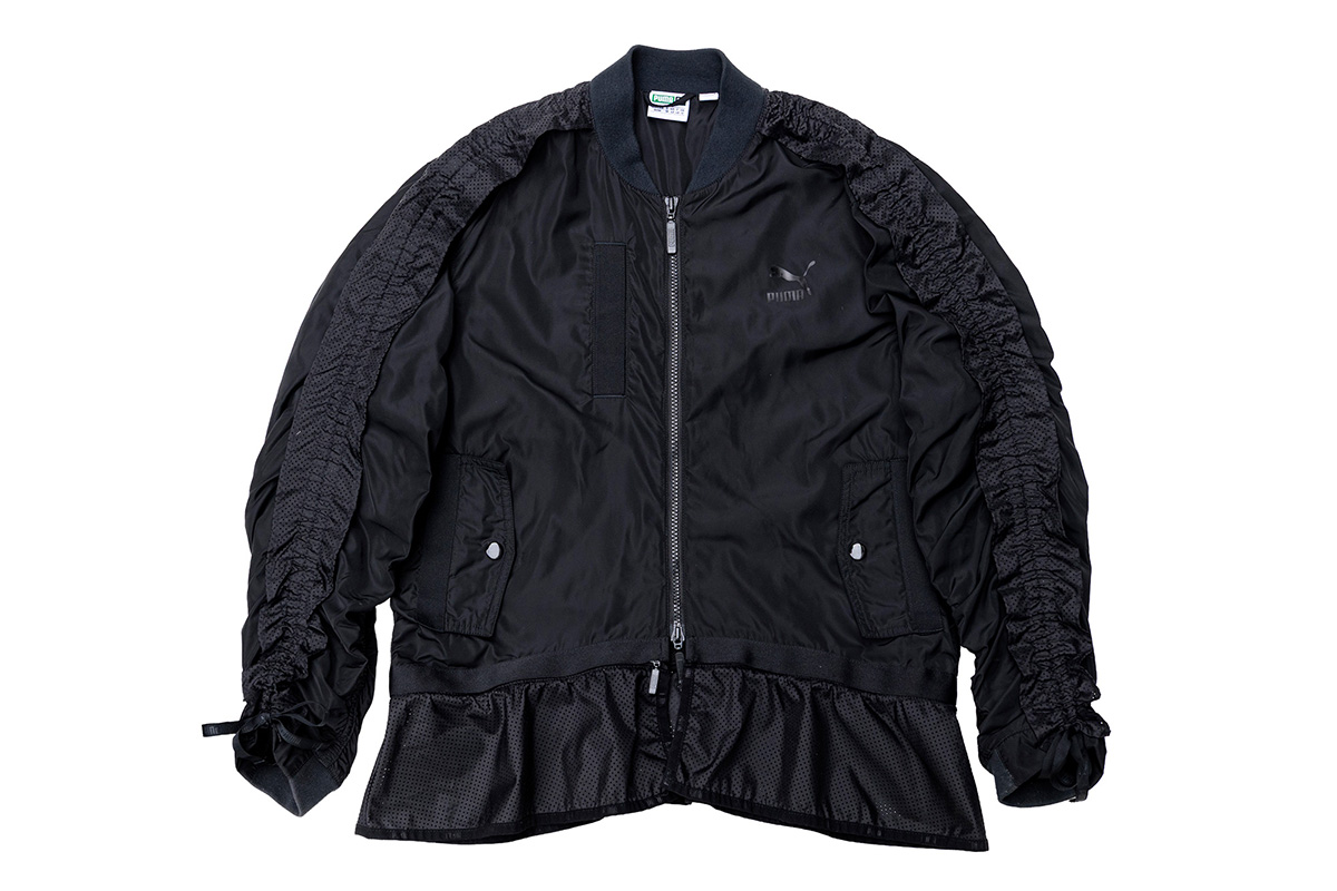 肩から腕にかけて大胆に配されたギャザーが印象的なブルゾン。ディテールにはリボンやフリンジなども施されており、モードとフェミニンが融合したデザインが魅力。