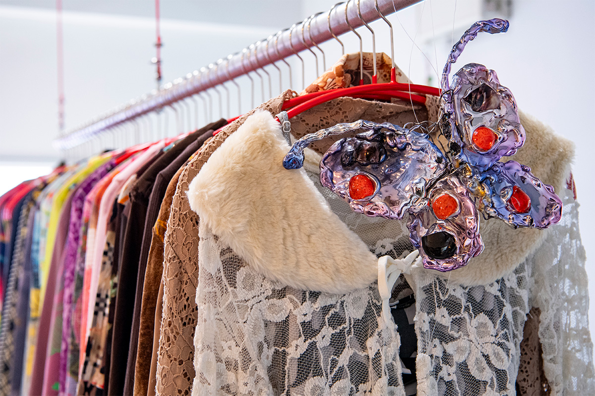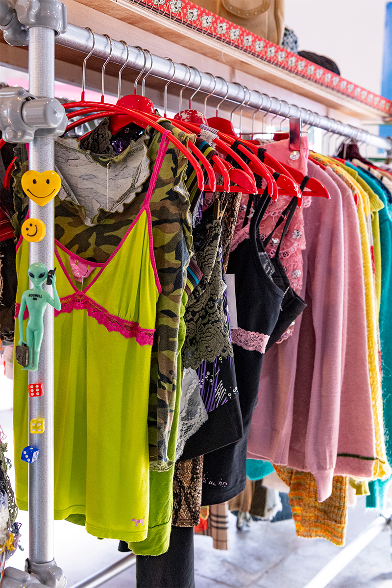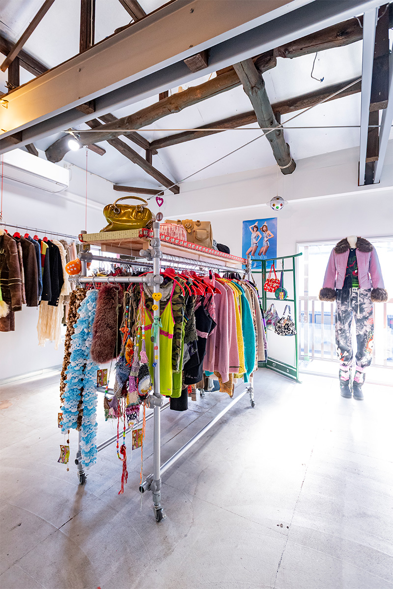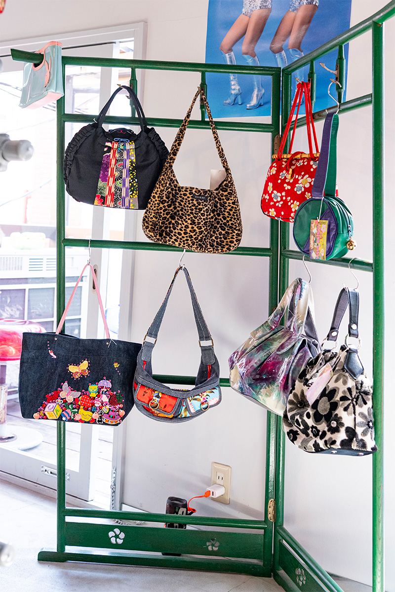 取り扱いアイテムは、レディースの古着を中心に、アクセサリー、オリジナル商品など。主にアメリカやヨーロッパで買い付けた、1990年~2000年代のカジュアルなアイテムが揃う。セレクトの基準は、Ayaさん自身が着たいと思えるかどうか。また、サイズ感やデザイン性も重視しているという。実際に商品をみてみると、他のユーズドショップや新品のお店ではあまり見ることができないユニークなデザインが魅力的で、サイズ感は全体的にタイトな印象だ。