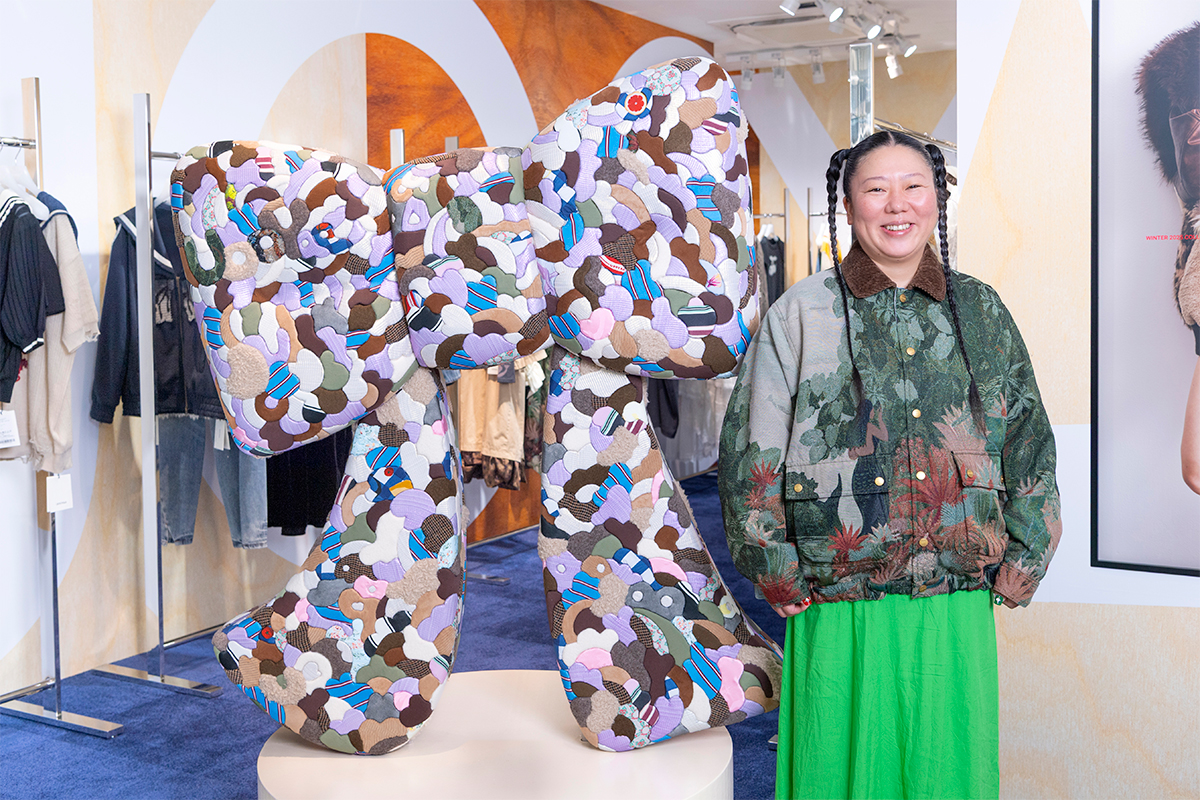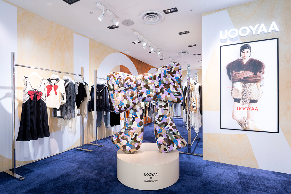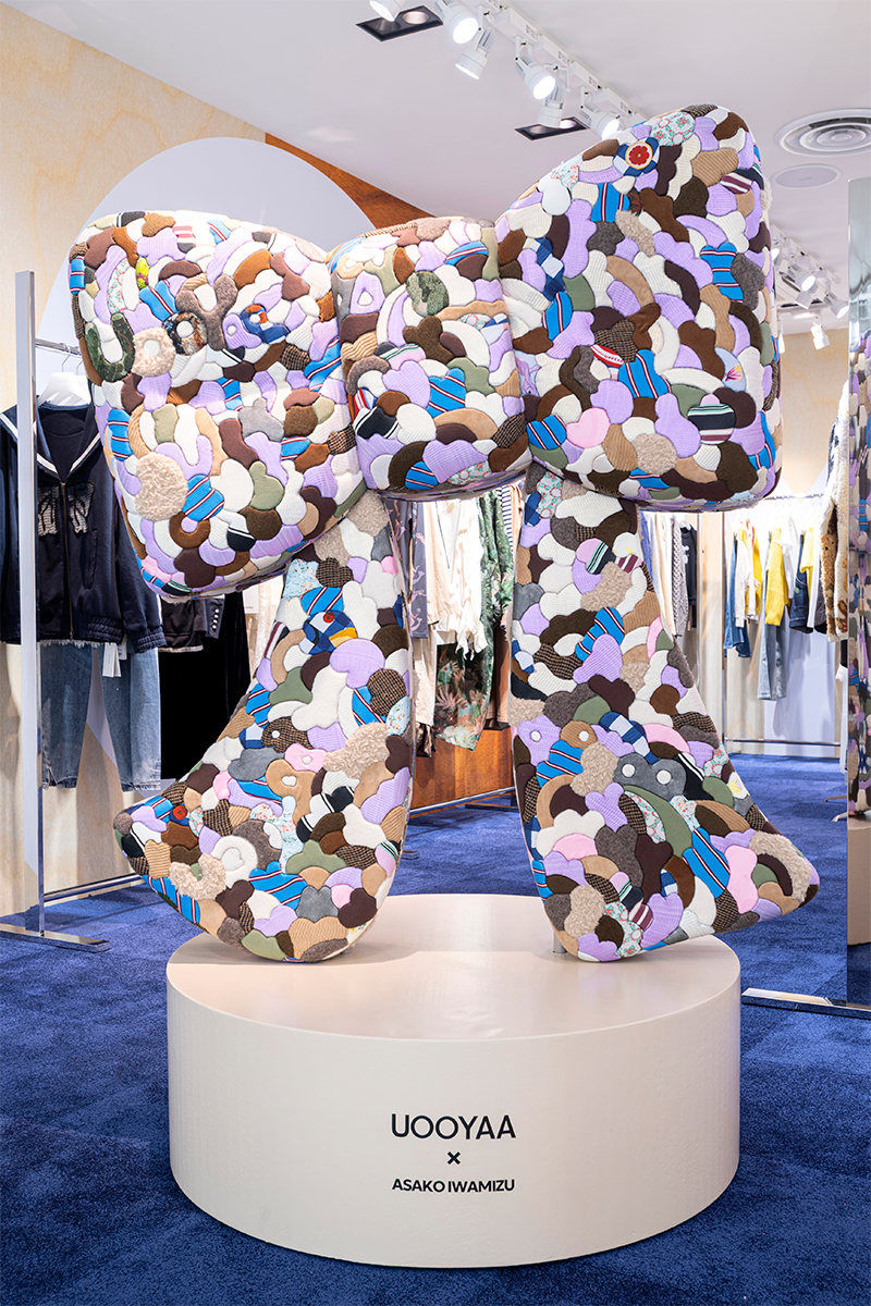 また、店舗のアイコンとなっているのがアーティストのイワミズアサコさんがUOOYAAの余剰生地を用いて制作した、巨大なリボンのオブジェ。今回のために作られた特別なオブジェが、訪れた人たちを温かく迎えている。UOOYAAの服をまとい、このリボンの前で写真を撮っても楽しいかも!