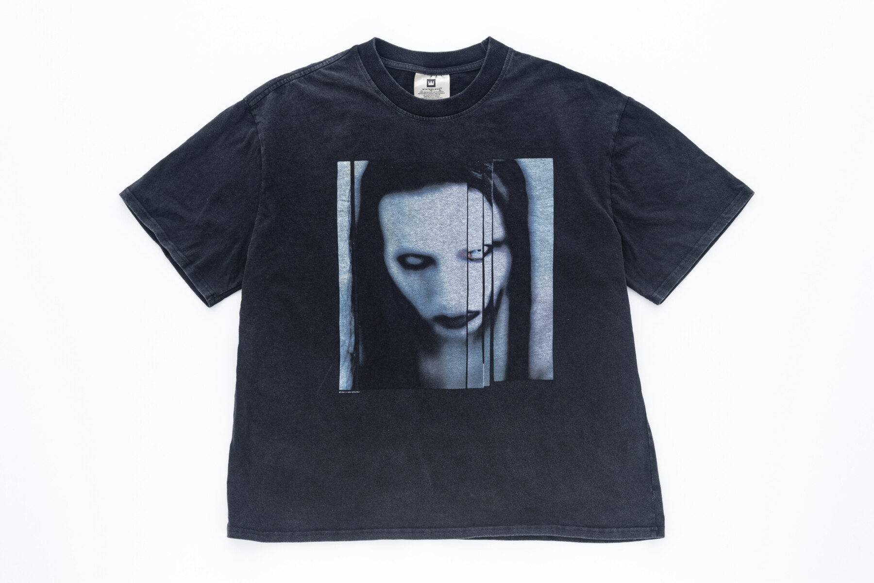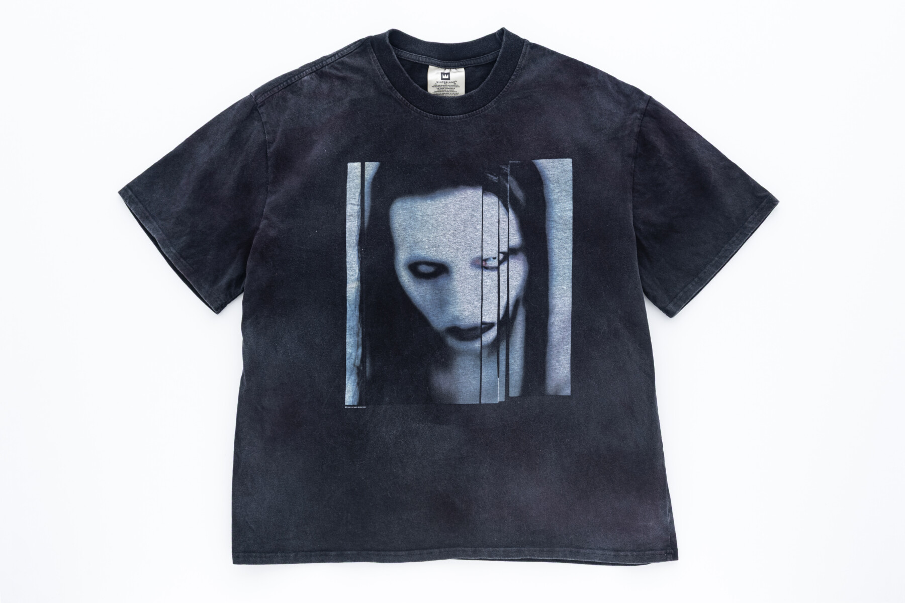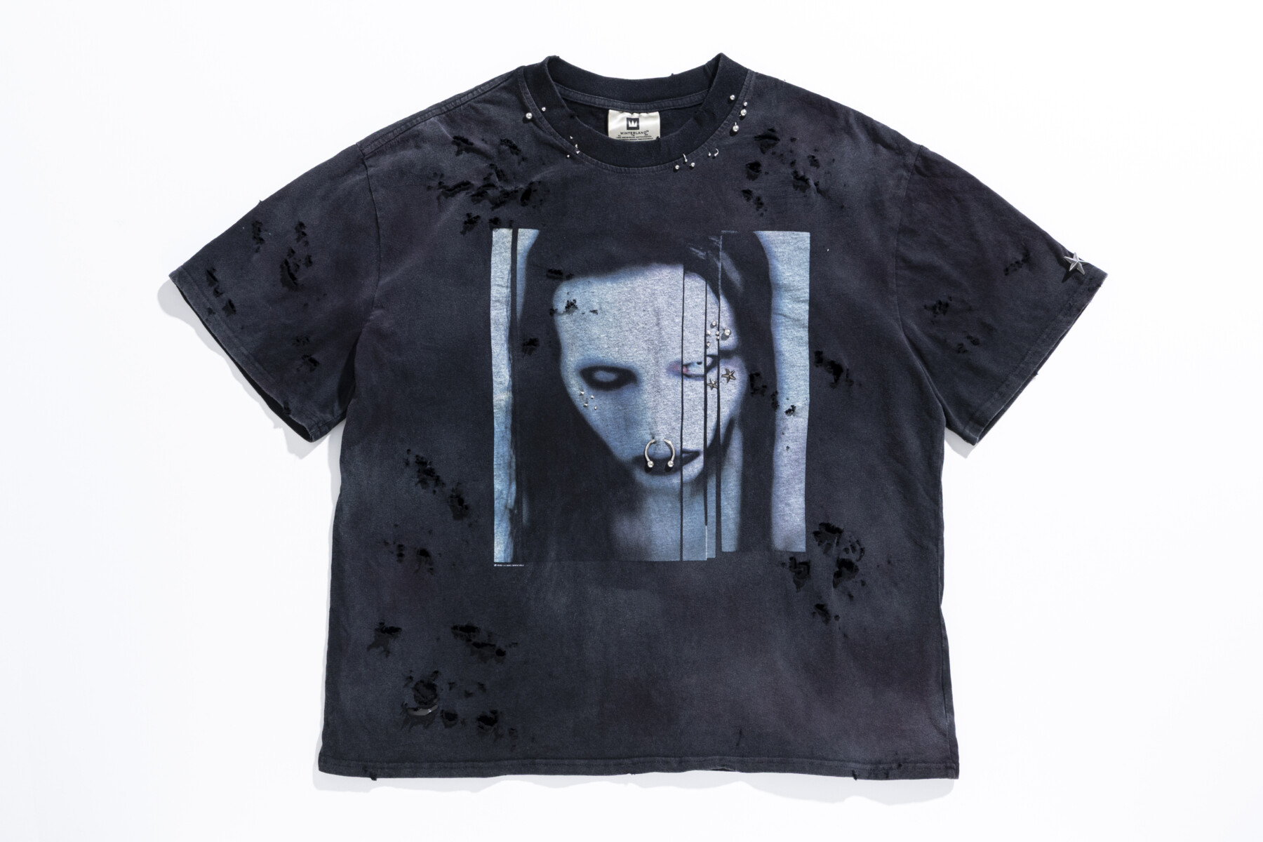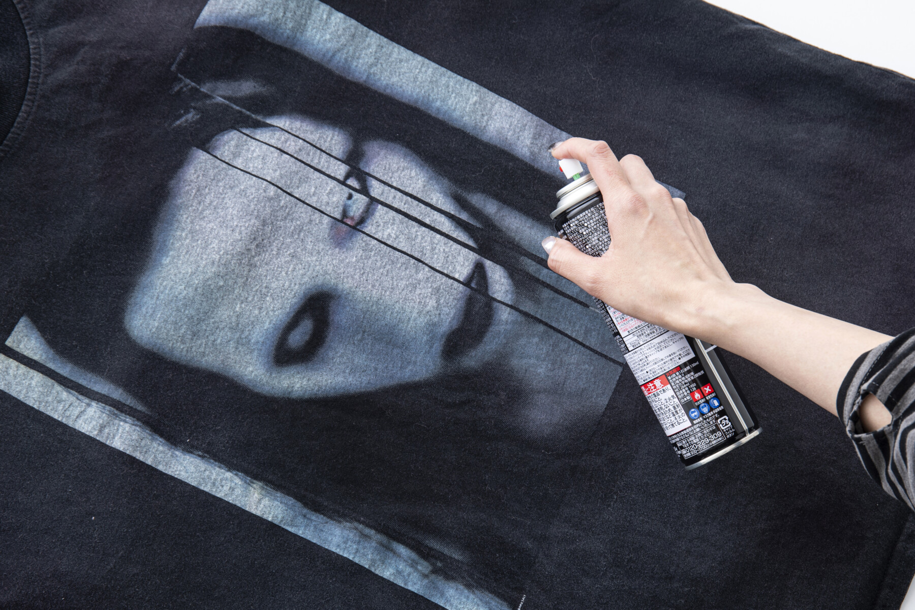 今回はダメージ加工を施すため、より風合いが引き立つプリント入りのバンドTシャツをセレクト。田中さんが過去に古着屋で購入したマリリン・マンソン のTシャツを使用。元のデザインを生かしながら、手軽に行えるリアルなダメージ加工を施していきます。