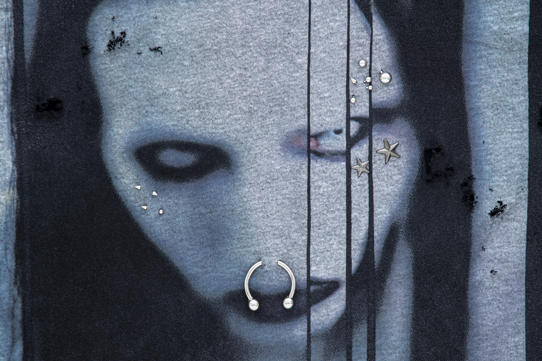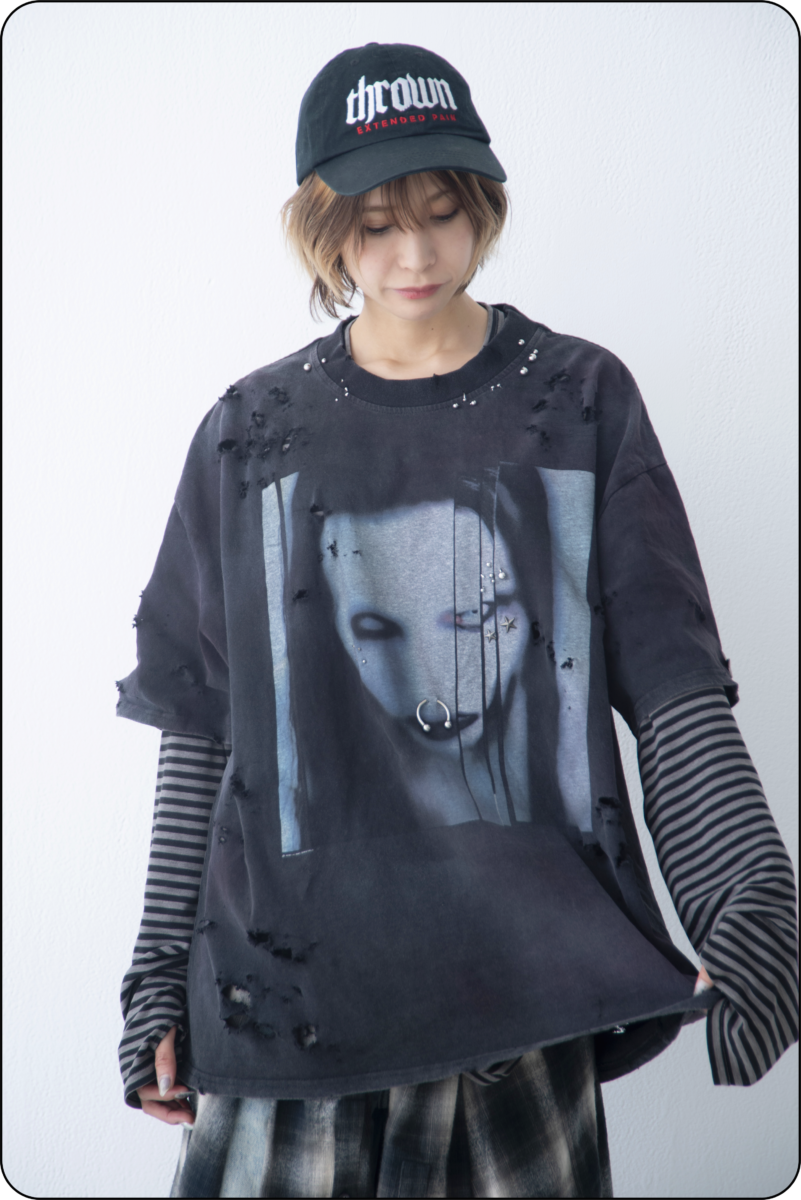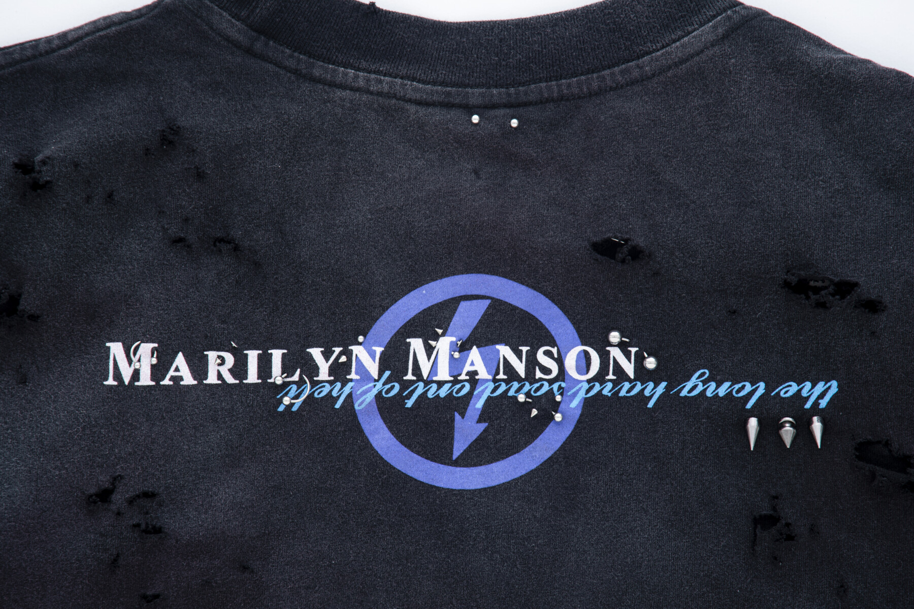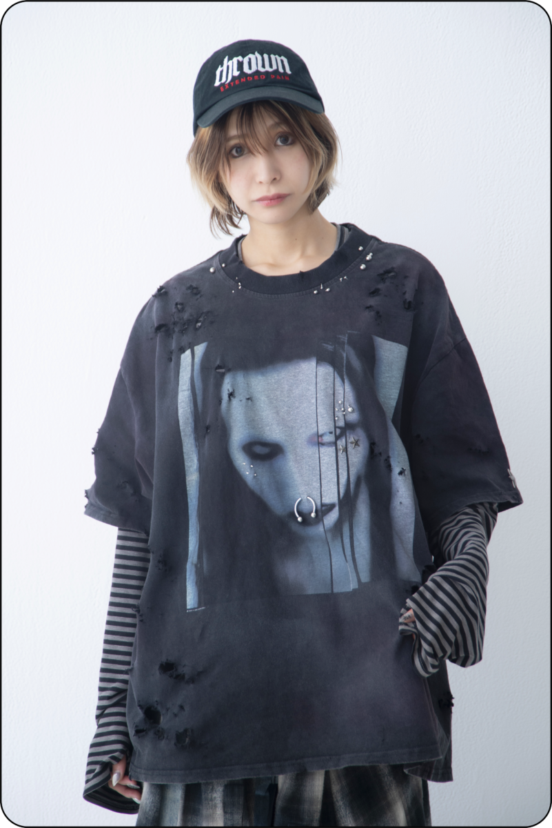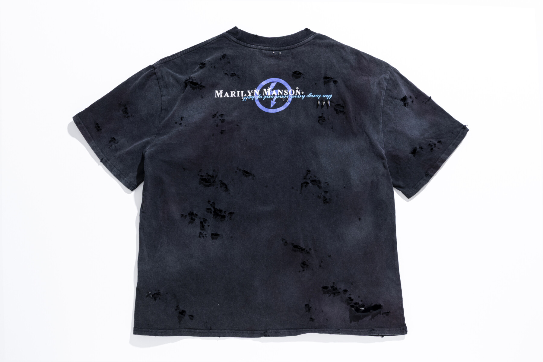 今回はダメージ加工を施すため、より風合いが引き立つプリント入りのバンドTシャツをセレクト。田中さんが過去に古着屋で購入したマリリン・マンソン のTシャツを使用。元のデザインを生かしながら、手軽に行えるリアルなダメージ加工を施していきます。