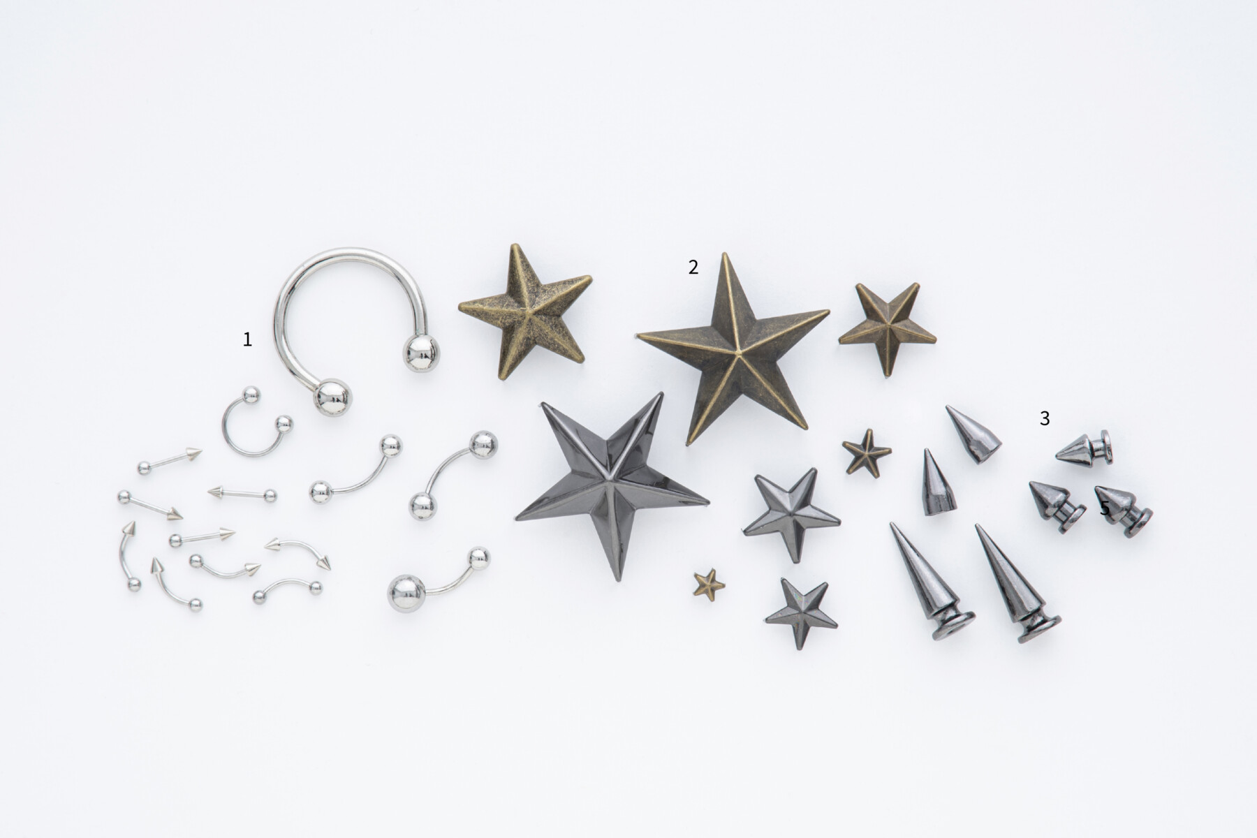 次に、ピアスやスタッズなどのパーツを取りつけて装飾していきます。