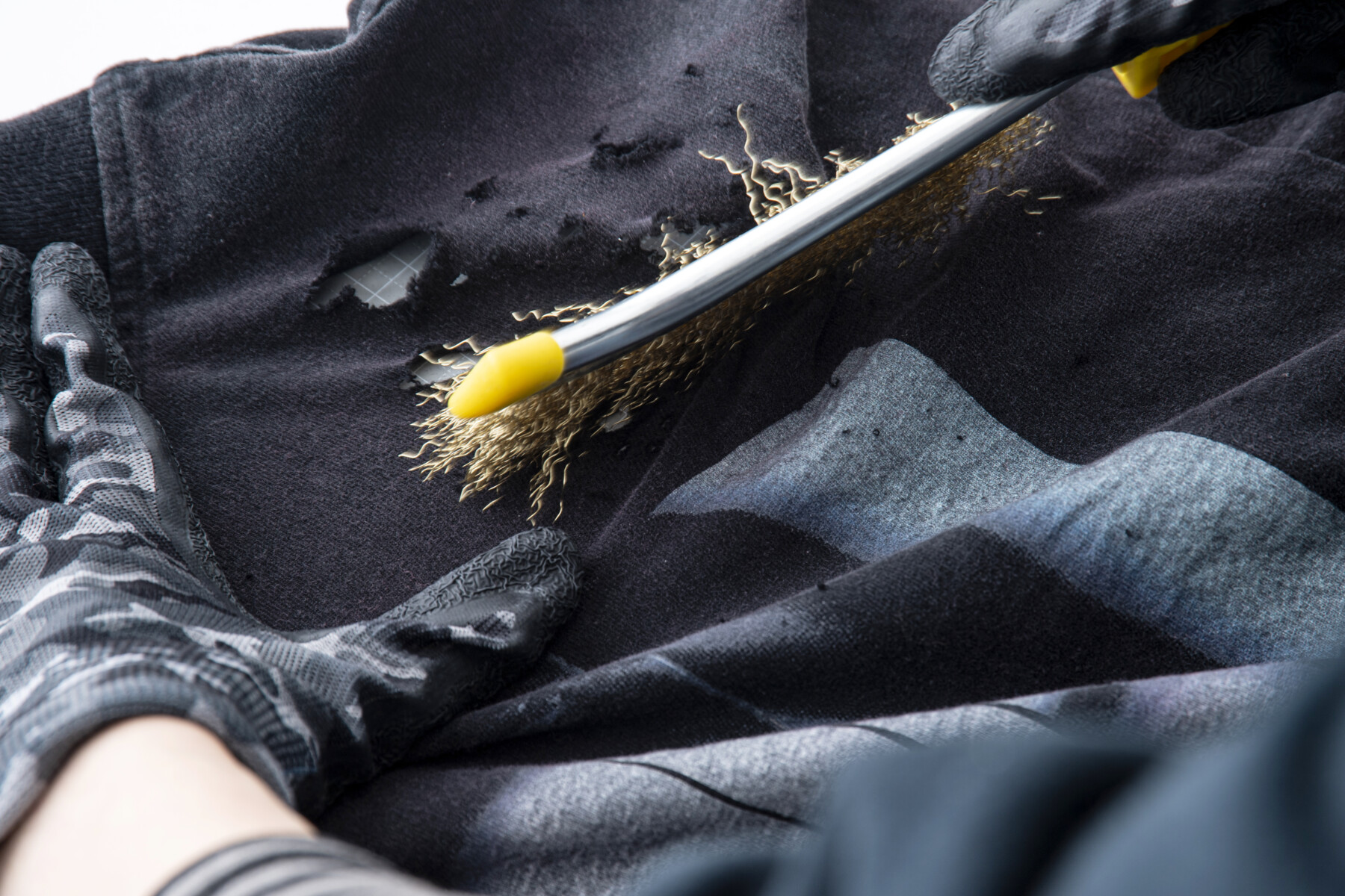 穴があいたらワイヤーブラシで切れ目の周りを擦り、生地の繊維を表に出せば、よりダメージ感がプラス。この工程を繰り返しながら、前後全体に程よくダメージを入れていきます。