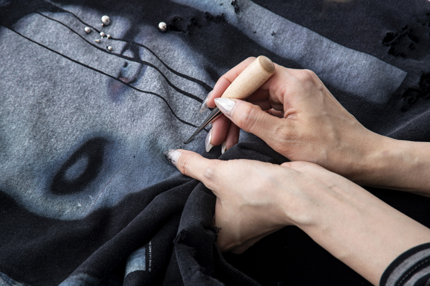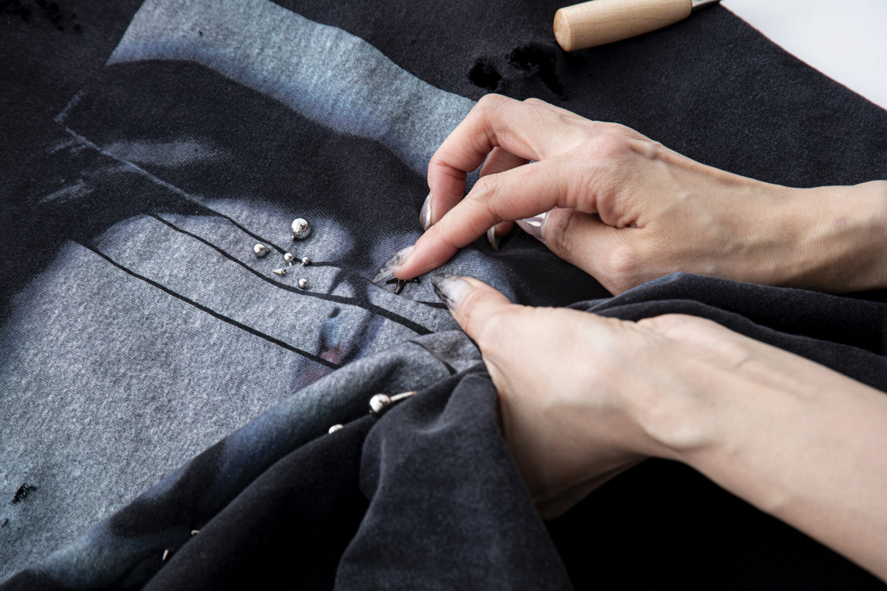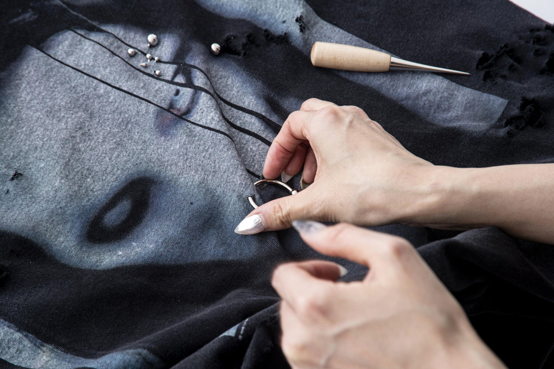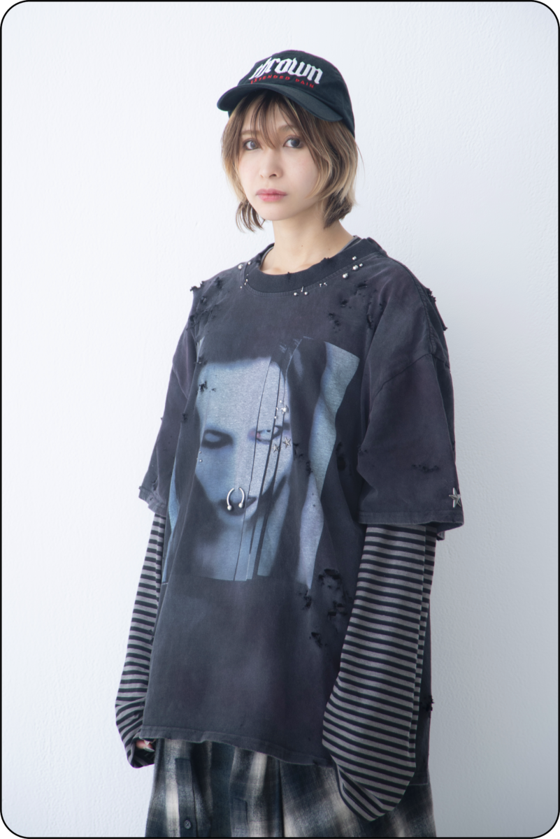 「今回は、裁縫未経験の方でも誰でも簡単に真似できるよう、特別な機材を使わず手軽にできるリメイクに仕上げました。Tシャツの元のデザインを生かしつつ、大胆にピアスやスタッズを組み合わせることで、ひと味違う存在感のあるアイテムにしています。スプレーやノコギリ、ワイヤーブラシを使えば、流行りのダメージTシャツも簡単にリアルな風合いを出すことができますので、ぜひチャレンジしてみてください」