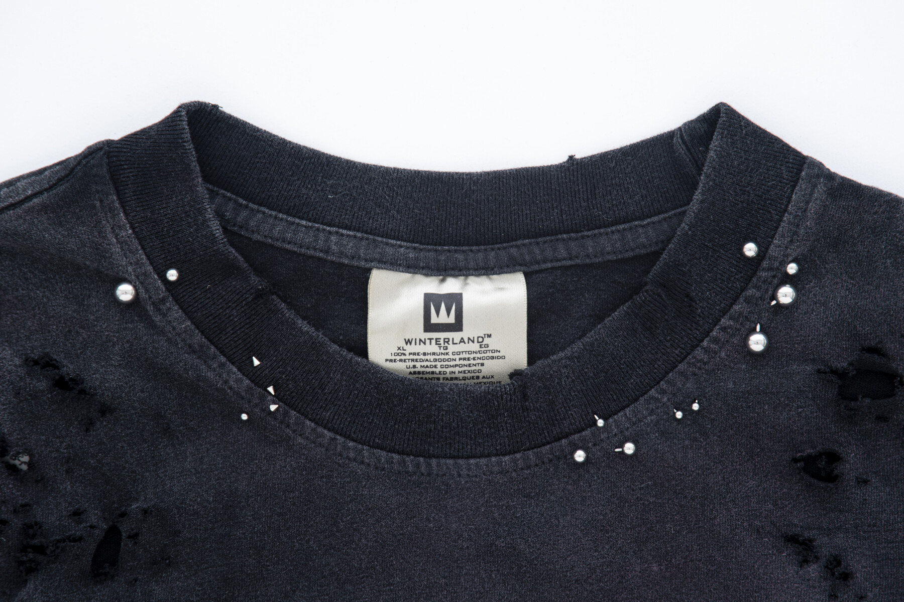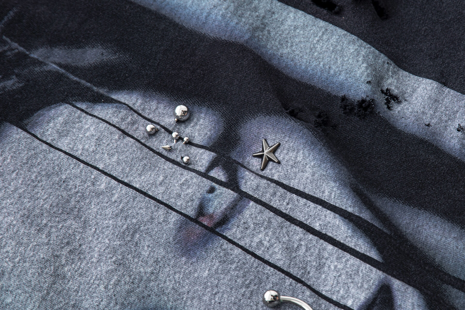 プリント部分や襟ぐりを中心に、ピアスやスタッズで装飾。フロントだけでなくバックのプリントや襟ぐりにも装飾を施し、エッジを忍ばせたデザインに。