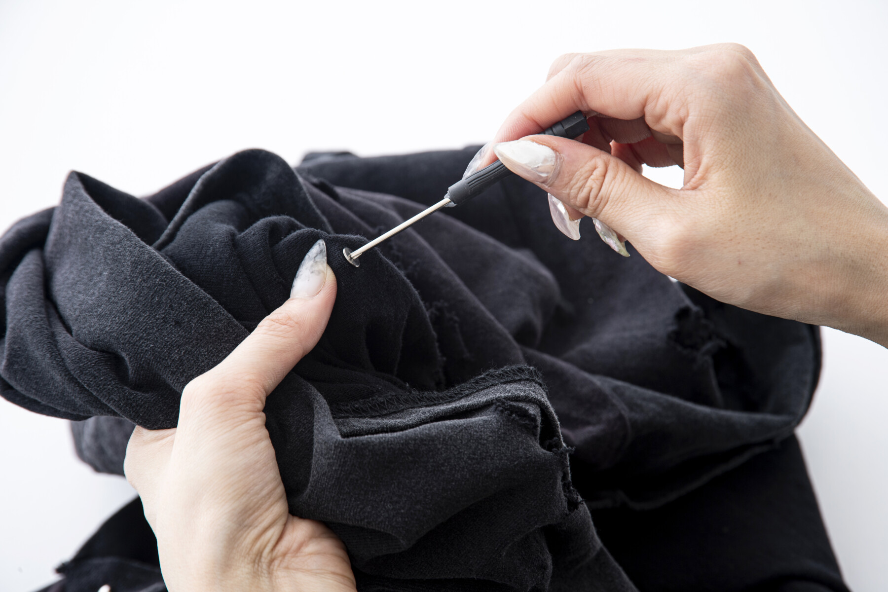 星のスタッズは、爪折りタイプを選べば手で簡単に装着できます。まずは目打ちで星の角に合わせて軽く穴をあけ、裏側で爪を折り曲げて取りつけていきます。袖口や裾につけてもさりげないアクセントになるのでおススメです。