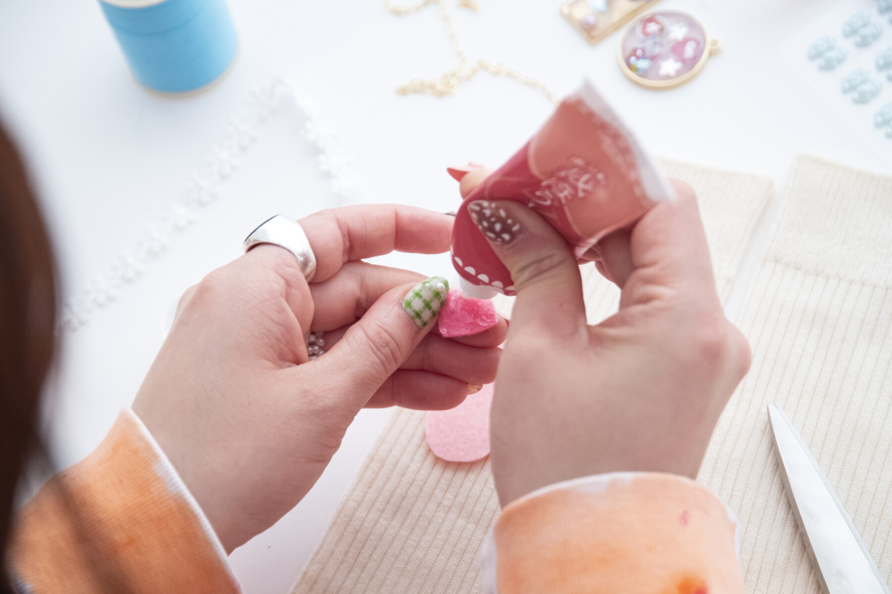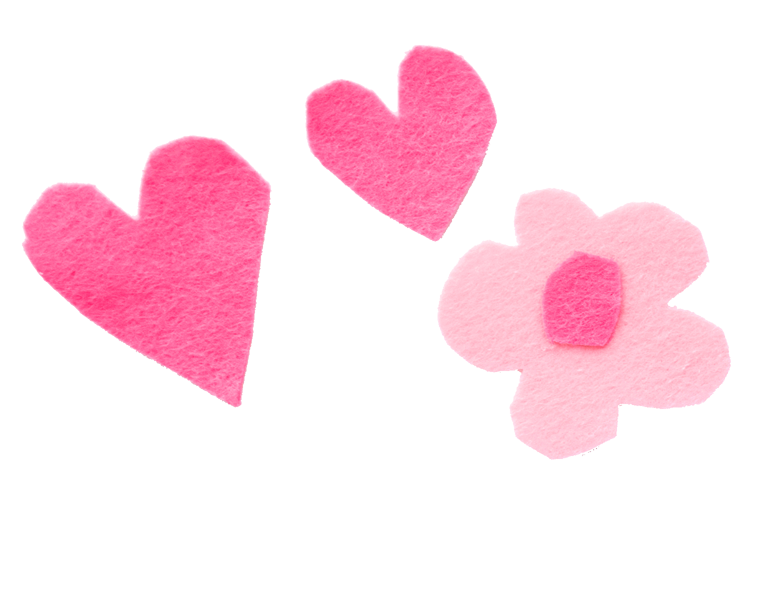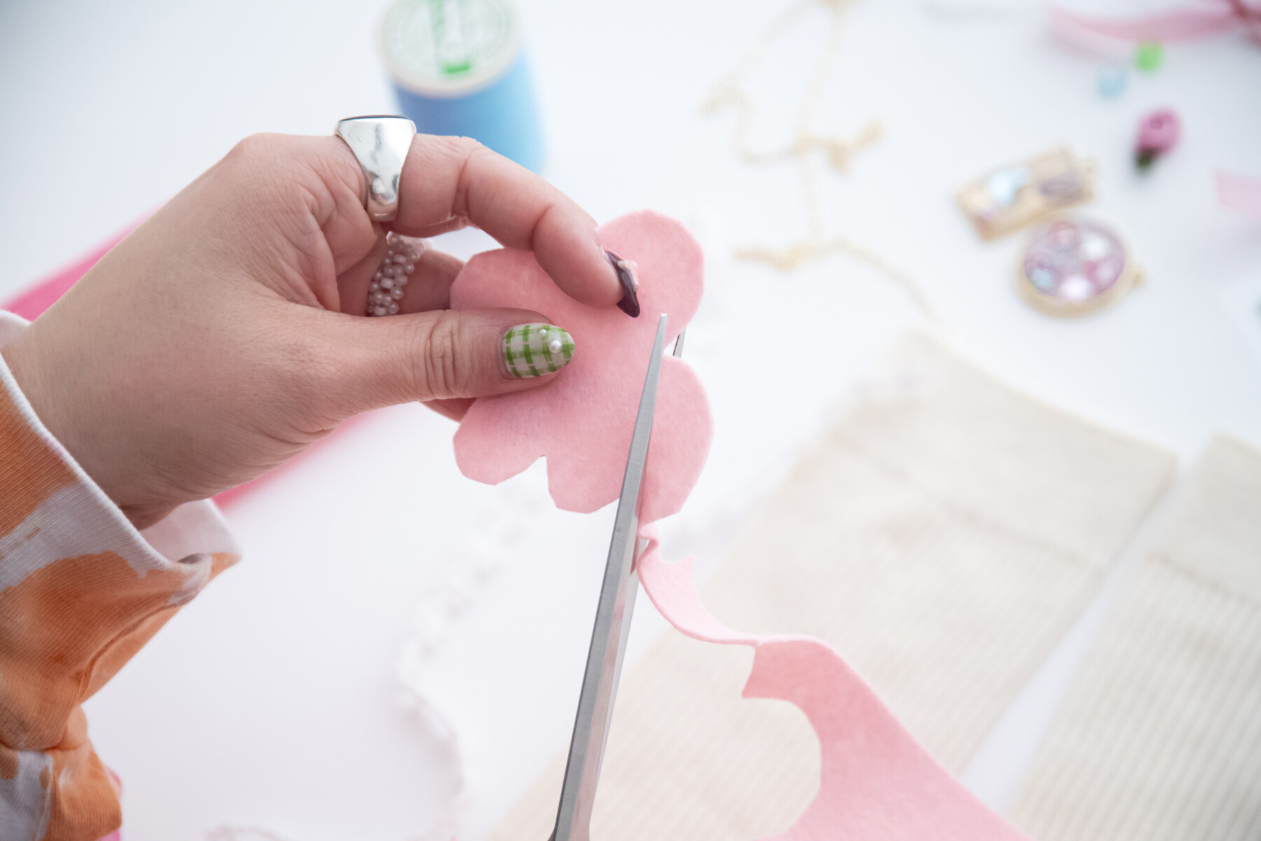 次は、フェルトをお花やハート型にカッティング。フリーハンドで少しいびつなくらいが可愛い。お花の中心部分は色を変え、布用接着剤で貼りつけます。工作のように、フェルトを思うままに切ったり貼ったりしながら、自由に好きなモチーフを作っていきましょう。