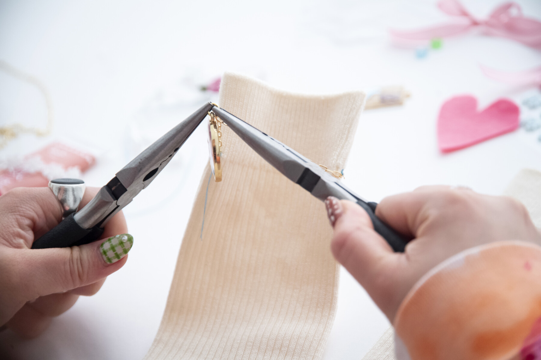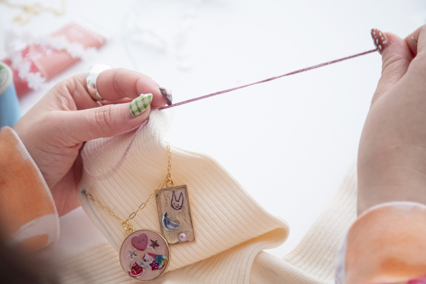 まずは、冒頭で作った円形とスクエアのチャーム2個を、小林さんと同様の手順で取りつけていきます。片足の横中心部分に、チェーンが垂れ下がるよう両端を縫いつけ、中央に2つチャームをつけます。
