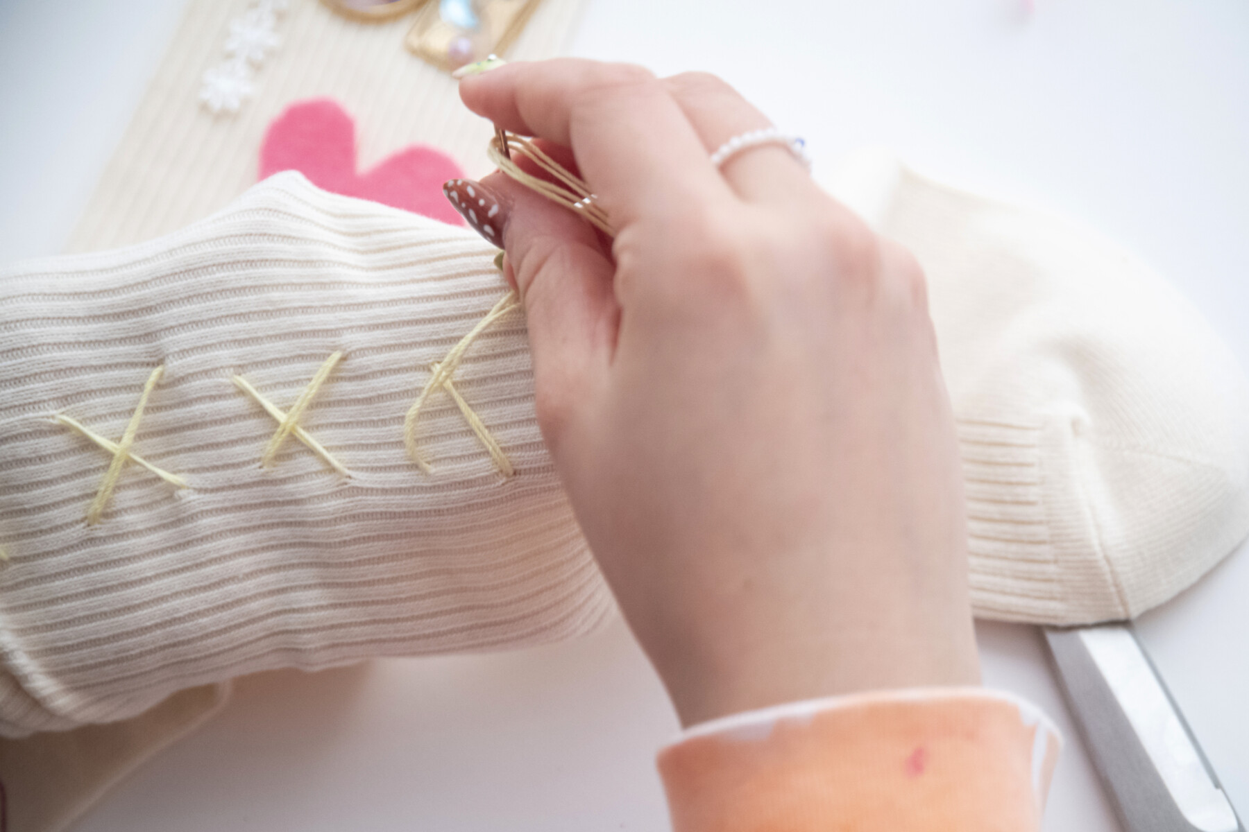 口ゴム部はランダムな縦ライン、センター部分はクロス状になるように縫っていきましょう。さらにフラワー刺繍テープで作ったリボン結びの中心にバラモチーフのパーツを縫い、口ゴム部のセンターに縫いつけていきます。