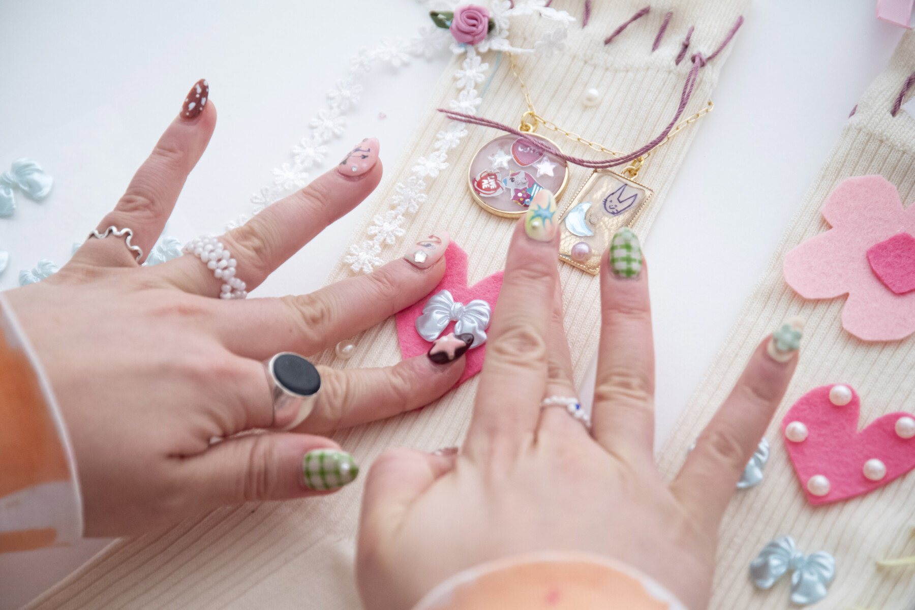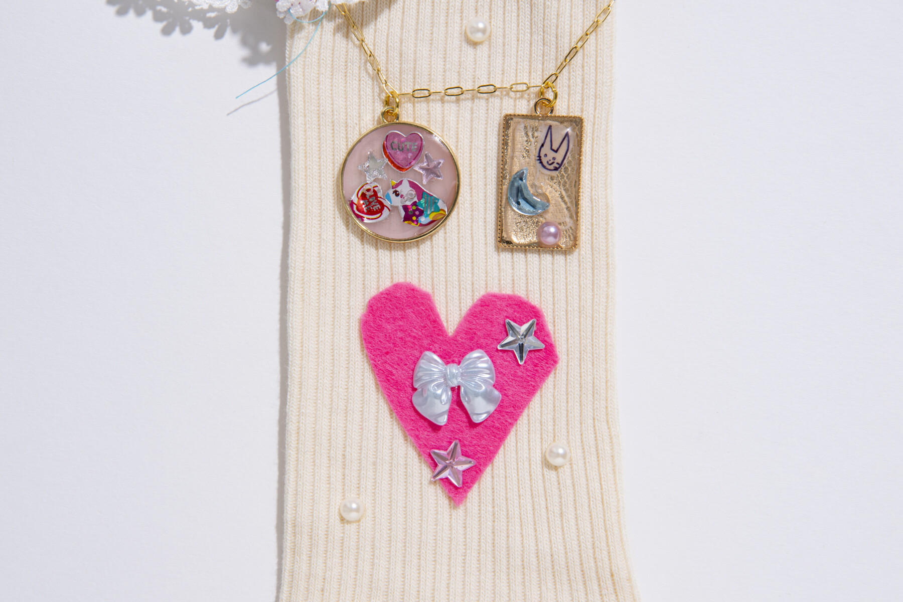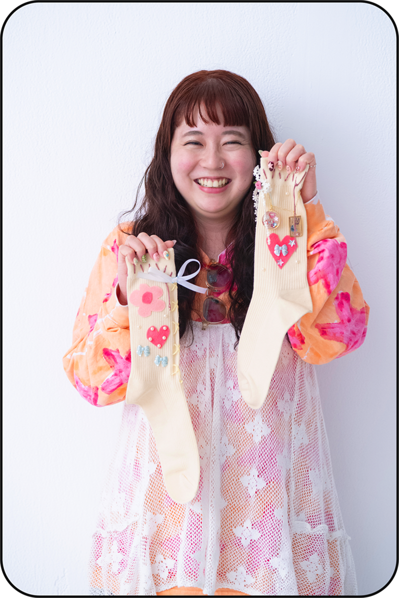 「フェルトをメインに、誰でも扱いやすい材料で可愛くまとめました。糸をあえて出したままにして遊び心を加え、足もとが華やかになるようなデザインにしています。Tシャツなどにも応用してレジンやシールで簡単にデコレーションできるので、ぜひみなさんも挑戦してみてほしいです」