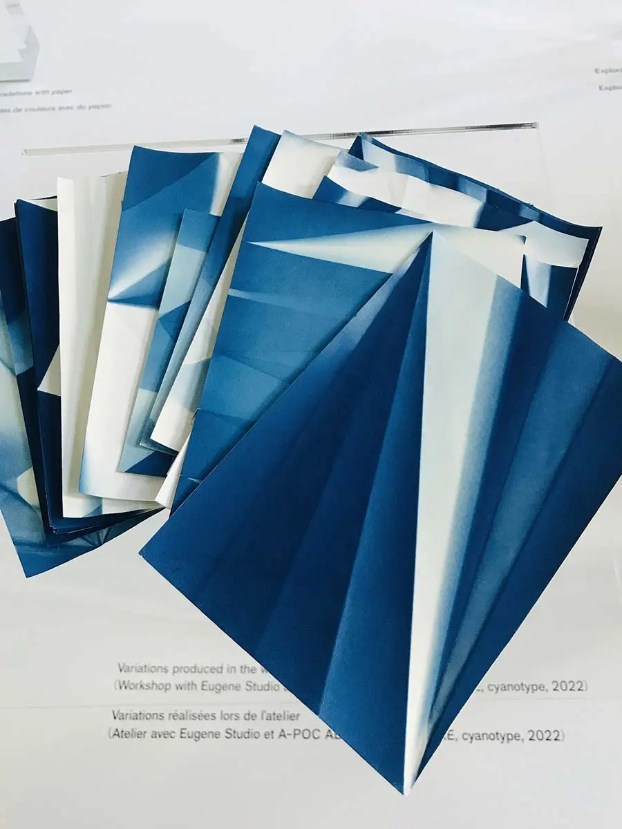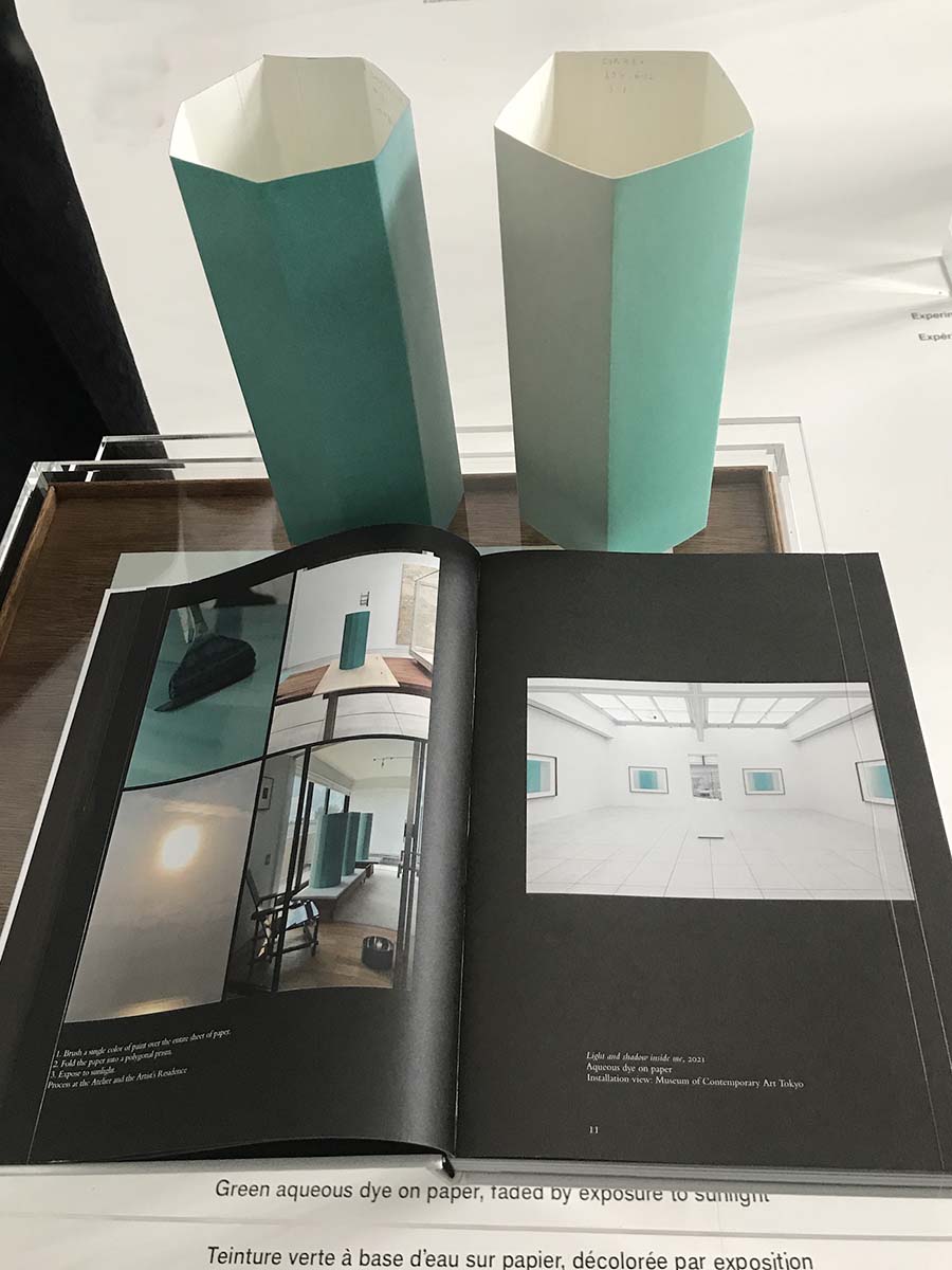 アイデアソースとなったそのシリーズは、太陽光の退色を用いた碧緑色の作品と、印画紙を用いたモノクロの作品の2種類がある。碧緑色の作品は、水彩塗料を全面に塗った紙を多角柱状に折り、太陽の光を数週間当てて退色させている。モノクロの作品は、カメラやフィルムを使わない写真であるフォトグラム。これらは、紙と光が持つ力という2つの要素によって、美しいグラデーションを生んでいるのだ。