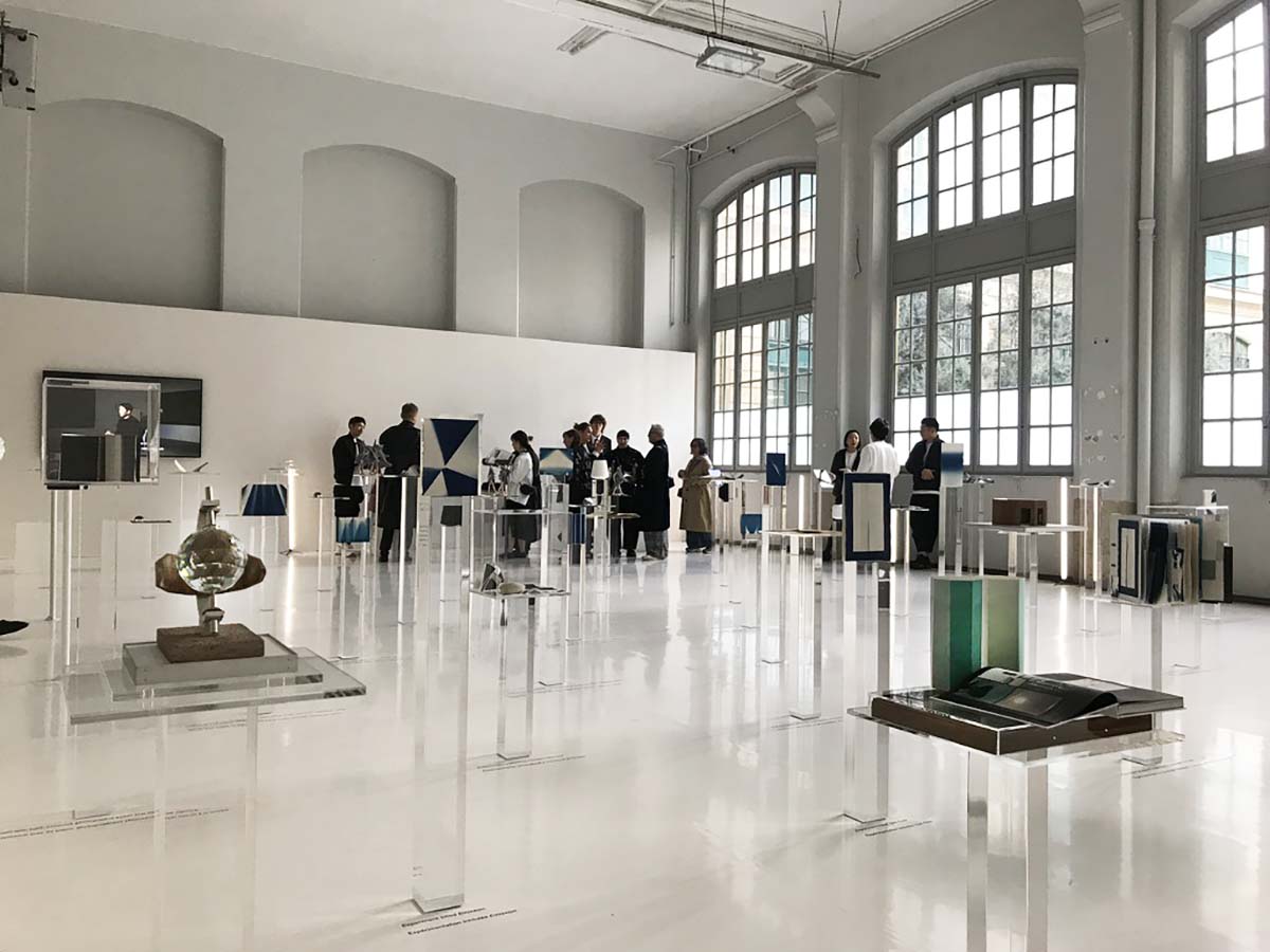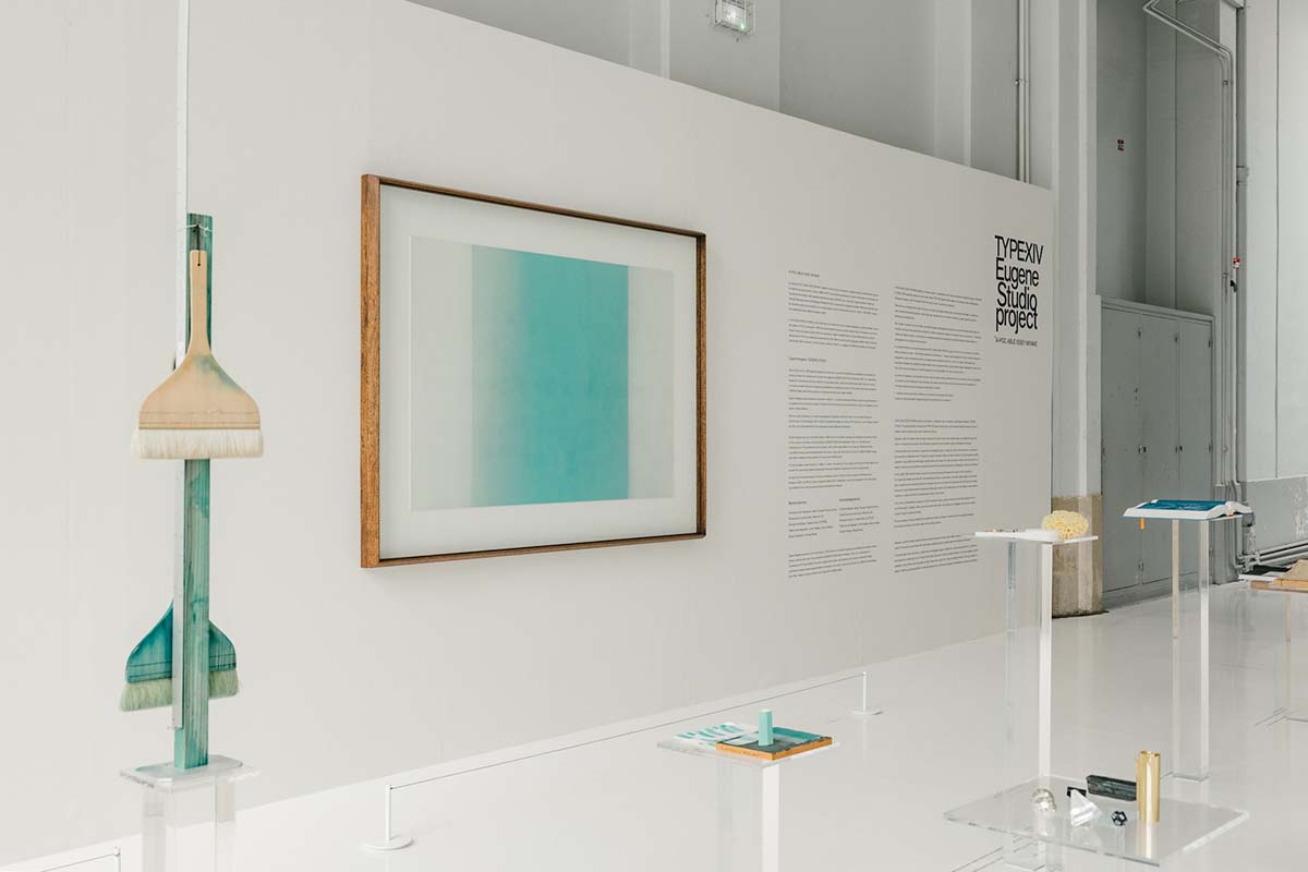 ユージーン・スタジオによる作品制作の記録なども展示。碧緑色の作品は、150通りもの塗料と紙の組合せの実験を経て完成したという。