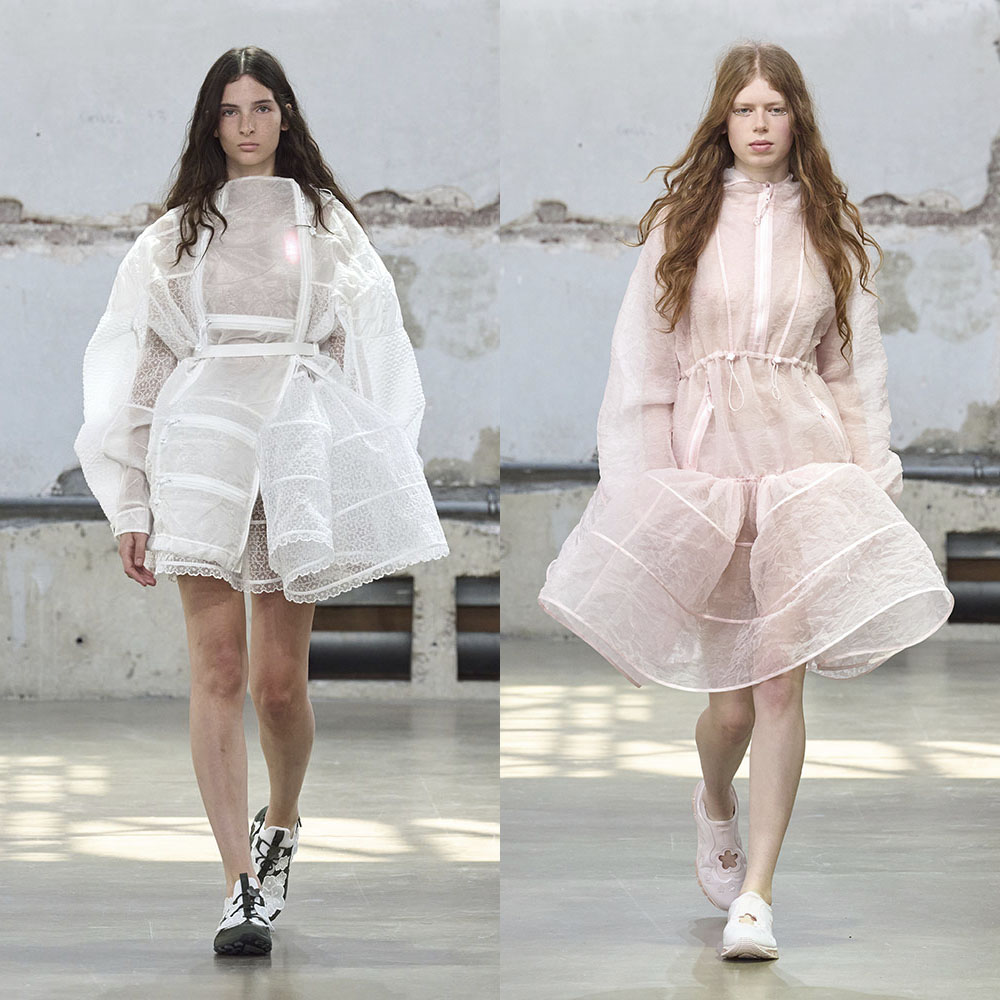例えば、裏地が裾から出ているトレンチコート(写真下)。洋服が縮んで裏地が出てしまったらそれはがっかりするような出来事ですが、面白いデザインを施すことで楽しめるようになった、ということを表現しています。あまりハッピーではないモーメントを、デザインやクリエイティブの力でハッピーに転換させられるというメッセージで、それが重要だと思っています。