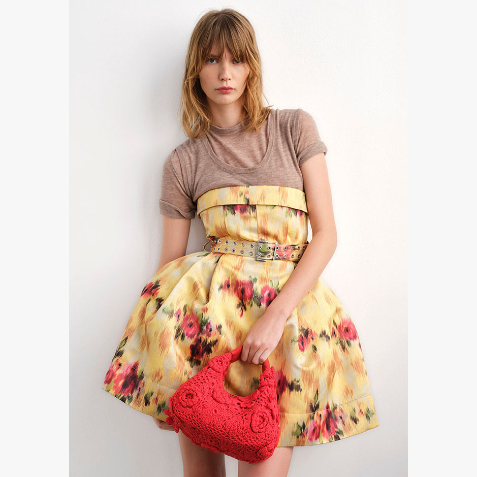 服が縮み、裏地が裾から出ているというストーリーのトレンチコート。裏地は中世ヨーロッパの絵画に見られたモチーフを手描きのイラストに翻案した柄で、エレガントなムードが魅力。¥125,290