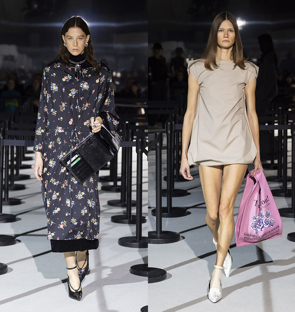 バルーン状のランダムヘムのプリント地が裾からのぞくトレンチコート。後ろ側にギャザーが入り、着るとコクーンシルエットのようになるのも魅力。