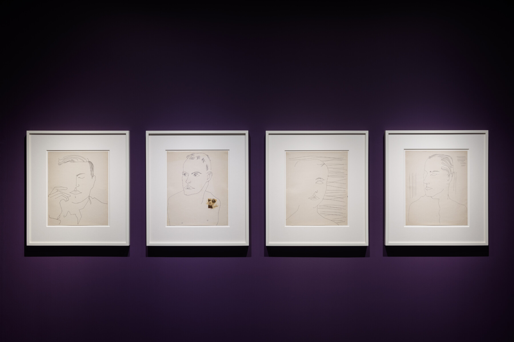 キャリア初期である1950年代にボールペンで描かれた若い男性のドローイングや、私的なスケッチ作品「Unidentified Male」、亡くなる前年に証明写真機で撮影されたにポートレート「フライト・ウィッグ(恐怖のかつら)」、1980年代の「Ten Portraits of Jews of the Twentieth Century」といった展示作品から、テーマの探求とその軌跡を辿ることができる。