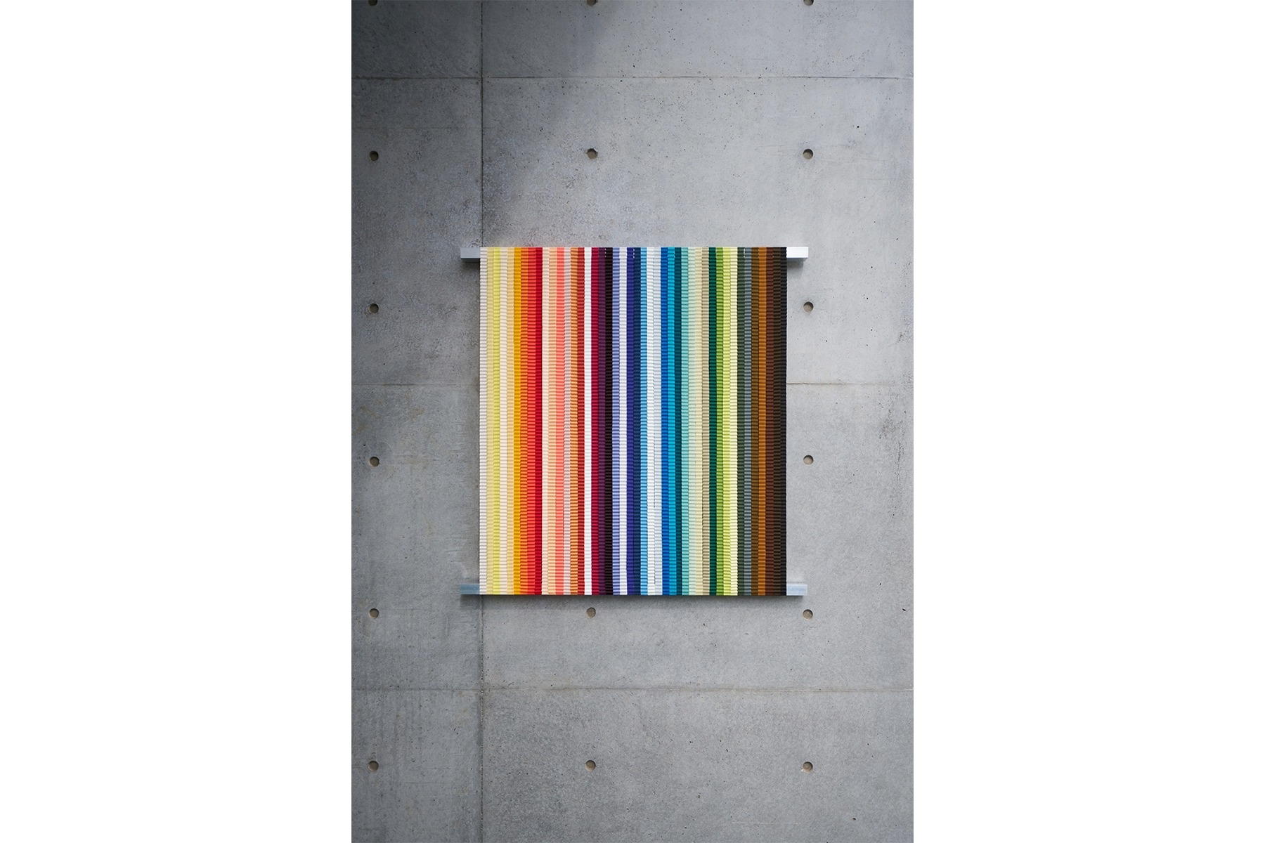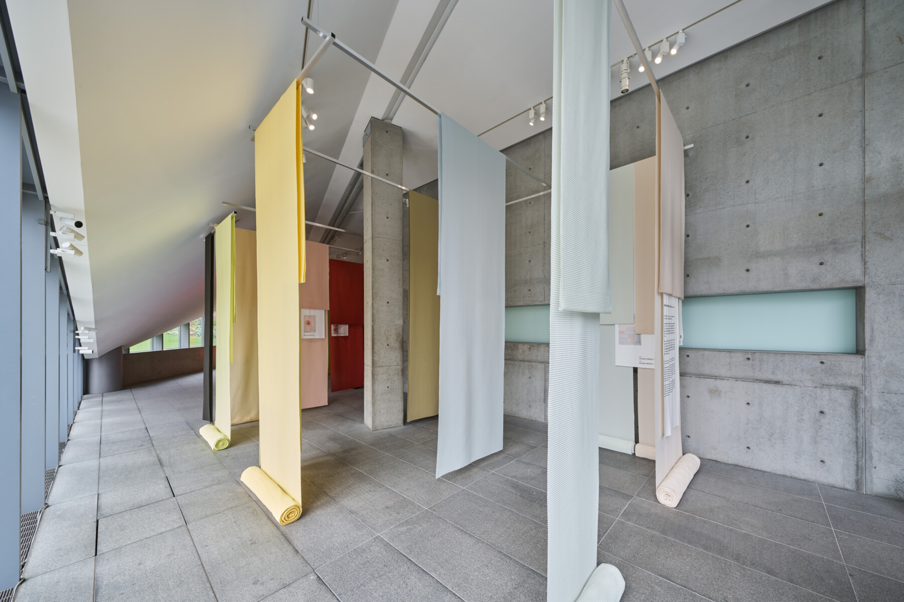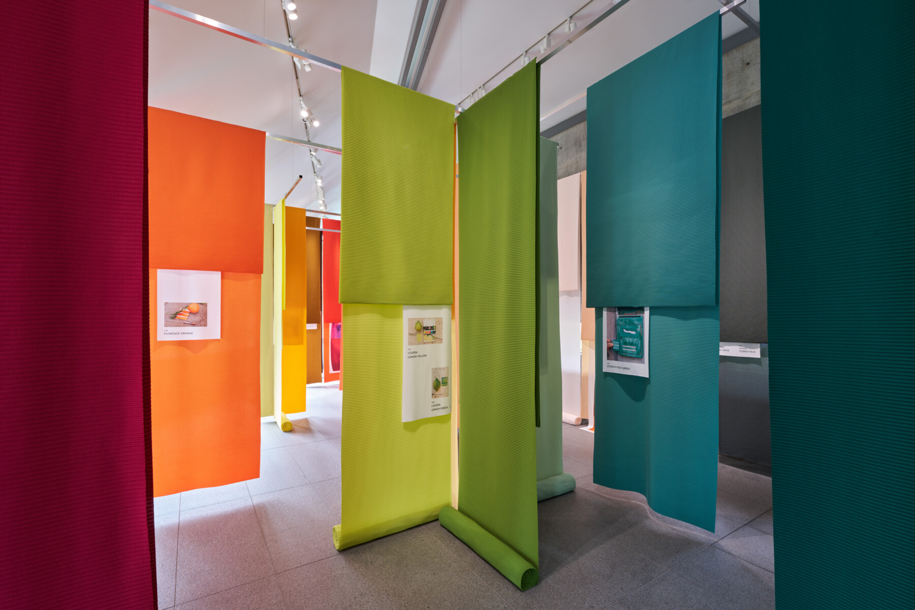 館内には、そうしたプロセスを経て完成させた200色の中から、44色をプリーツの生地として展示。フィールドワークによる学びと合わせて紹介することで、目指す色になるまで重ね塗りした痕跡や採集し続けてきた色見本が、イタリアの街に流れる空気や時間の移ろいを表現する。
