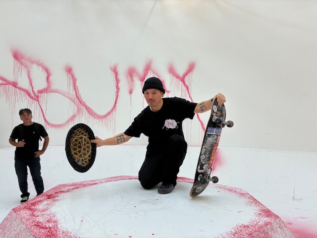 展示会場を巡っていると、「グオーッ。バタン」というスケートボード特有の音が聞こえてくる。のぞいてみると美術館中央の円形の展示室に、本格的なスケートパークが現れた。 このスペースを手がけたのは、プロスケーターの森田貴宏さん。彼は、1990年代から自身のスケート映像プロダクション「FESN」を運営もしているクリエーターだ。 SIDE COREは森田さんをゲストアーティストとして招き、彼は、スケートパークを作ってしまった。「街でスケボーするとき、通常、僕らは、社会の敵なんです。それを37年間やってきた」と森田さん。スケートボードにひらりと飛び乗り、一気に円周を巡った。「スケボーは、全身全霊を使って遊び、怪我もするけど仲間も助ける。友達と仲良くすることが世界を良くするパワーになる。ここには、いろいろな人たちがやってくると思うし、異なる価値観が共存することが大事。ここは、スケボー専用の空間ではなく、もっと社会性のある空間にしたかった。だから、ストリートをそのまま、ここにもってきたんだ」と森田さん。