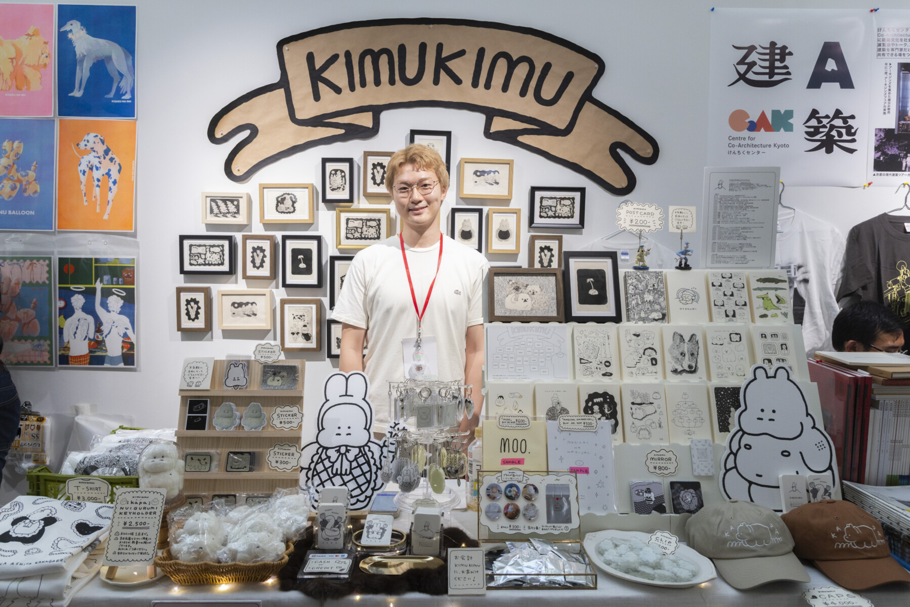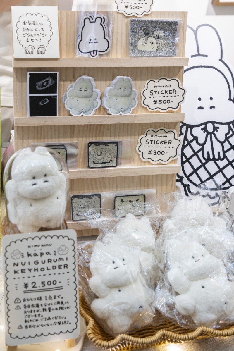 左・KIMUKIMUさんご本人とブースの様子。ポストカードや刺繍入りキャップ、ぬいぐるみなど、イラストを基に展開された多彩なアイテムがラインナップ。