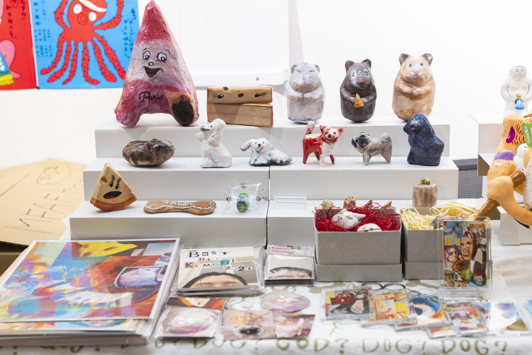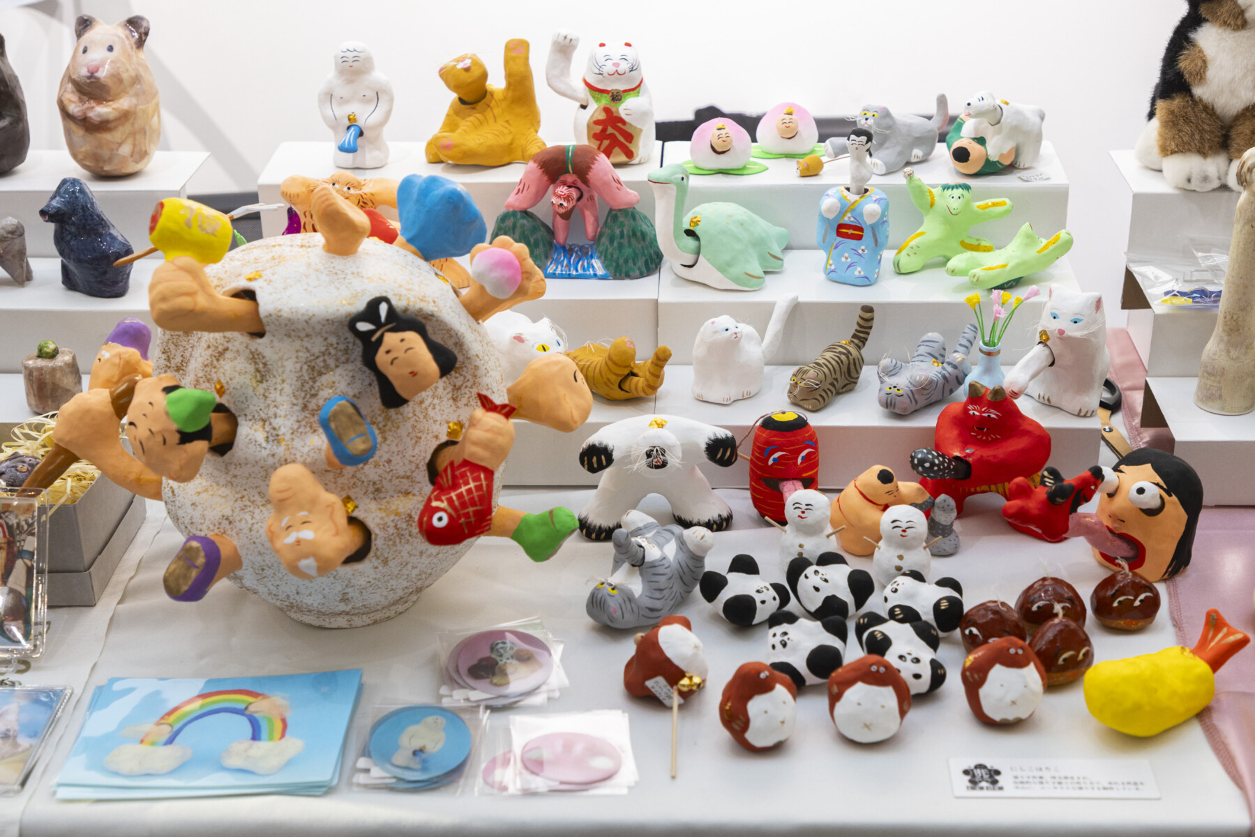 左・モンチッチとのコラボブースに展示された原寸大の犬とハムスターの立体作品。右・個人ブースでは、小さなオブジェやブローチ、ステッカーなどバラエティ豊かな作品が販売された。