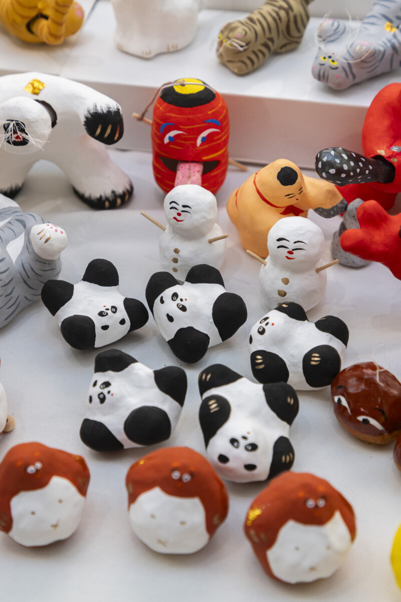 色鮮やかな彩りとゆるやかな表情、揺れる仕掛けに思わずほっこり!お化けや桃から顔を出す桃太郎などモチーフのユニークさも魅力的。
