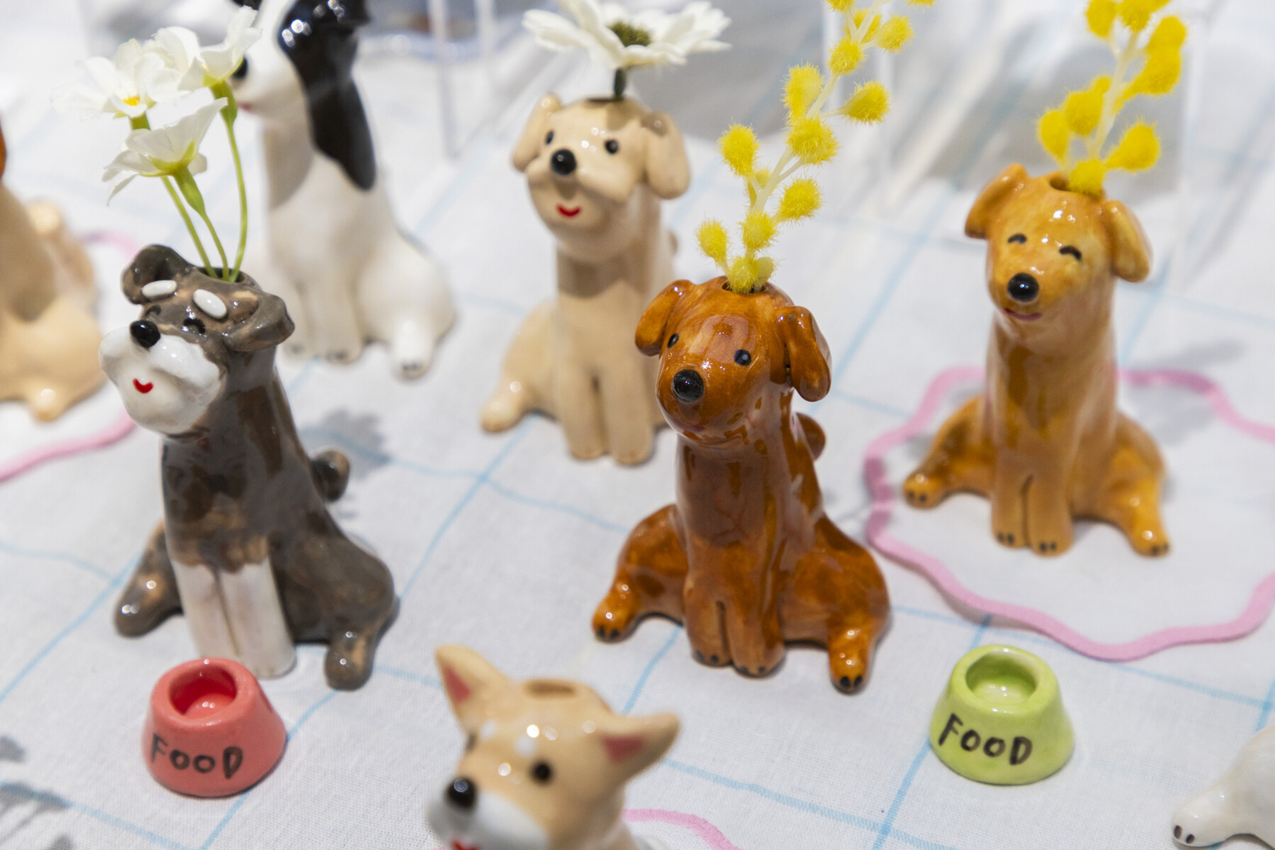 わんちゃんの頭に花を挿せる一輪挿しの花瓶や、わんちゃんの顔のブローチなど、個性豊かな作品が並ぶ。
