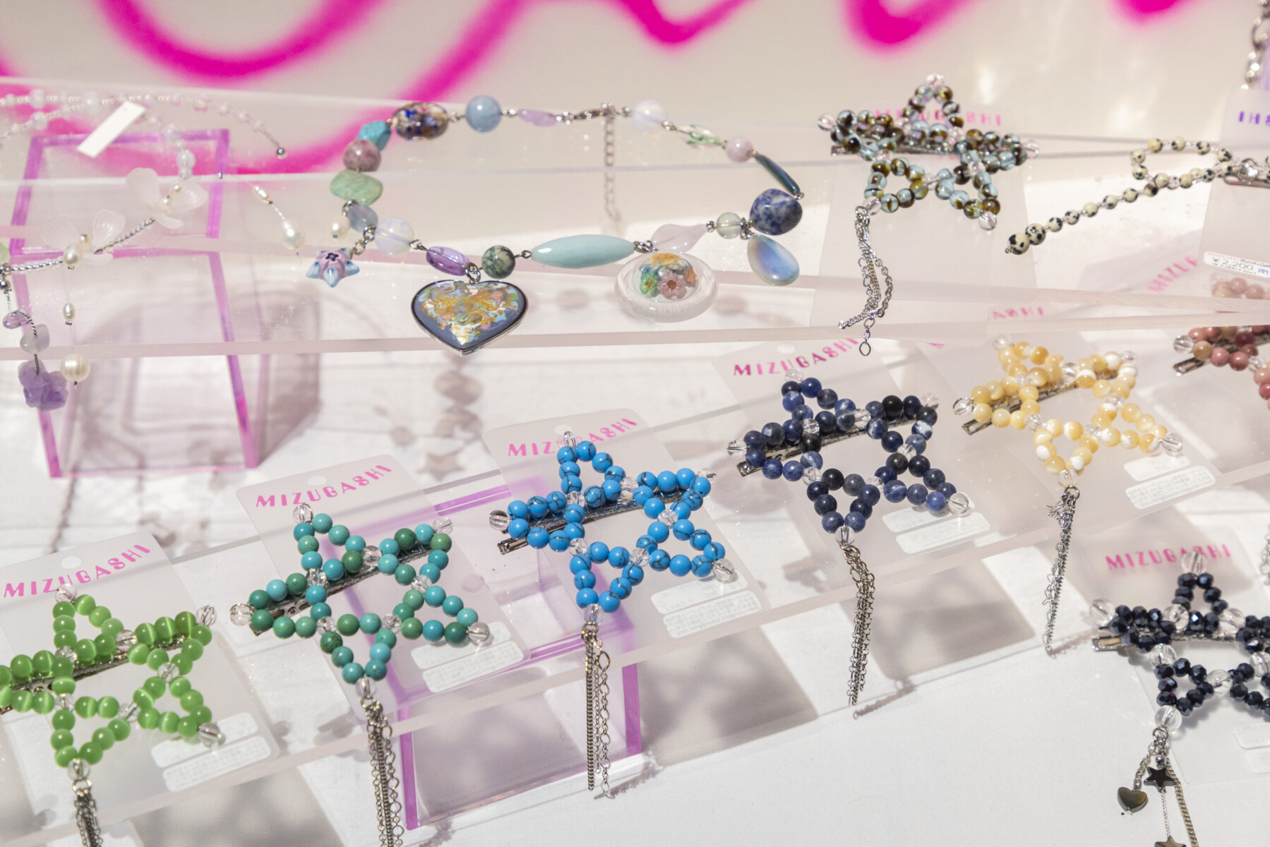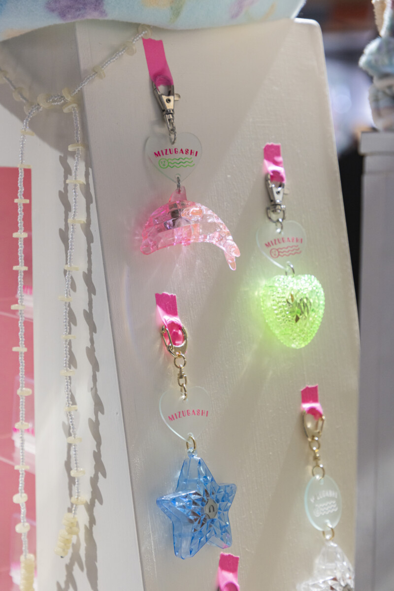 ネックレスやクリップ、光るおもちゃのキーホルダーなど、コーディネートをポップに彩る多彩なアイテムが並んだ。