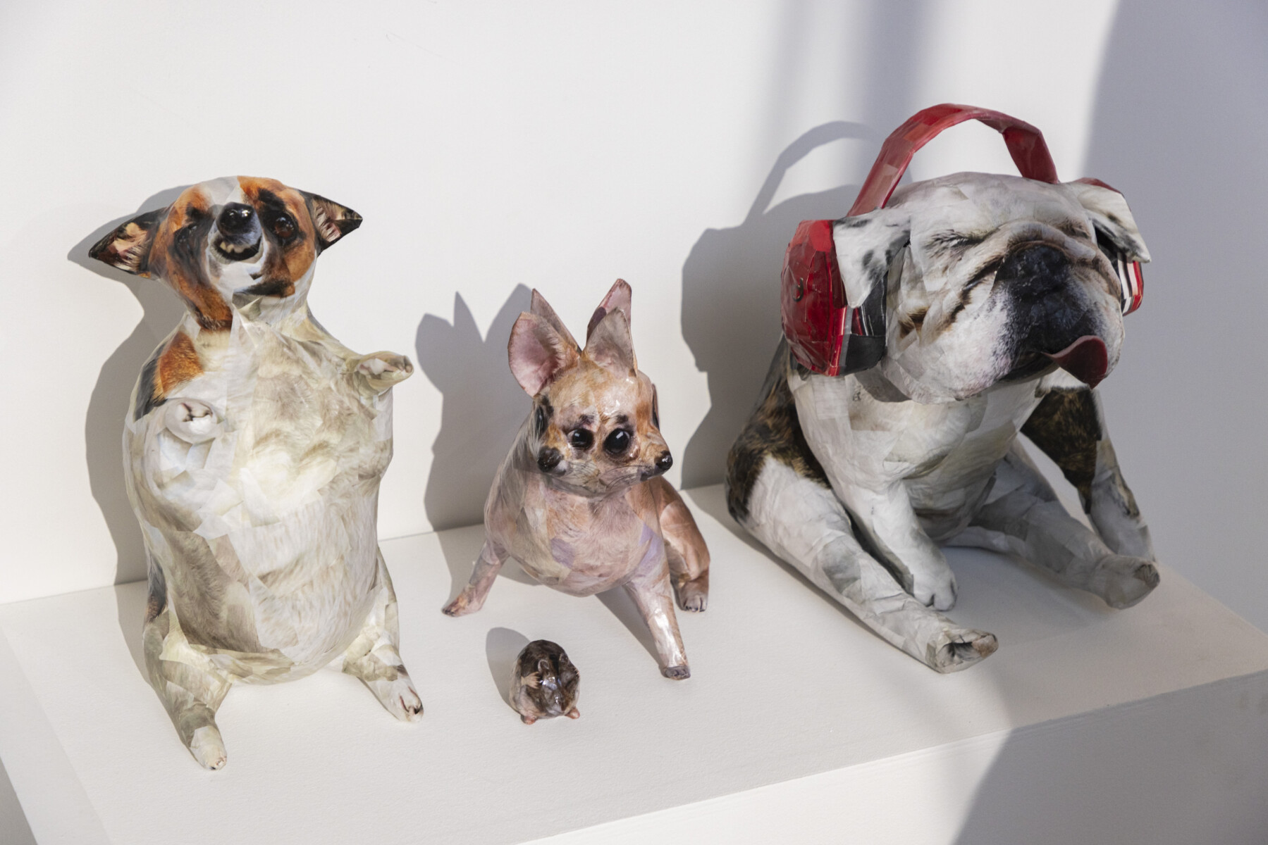 作家の時吉あきなさんは、スマートフォンで撮影した動物や食べ物などのモチーフを紙に印刷し、立体作品に昇華。本来立体である生物や食べ物を一度平面に落とし込み、再び立体へと再構築することで生まれる現実と非現実の境界の揺らぎが、どこか違和感のある世界観として鑑賞者を惹きつける。